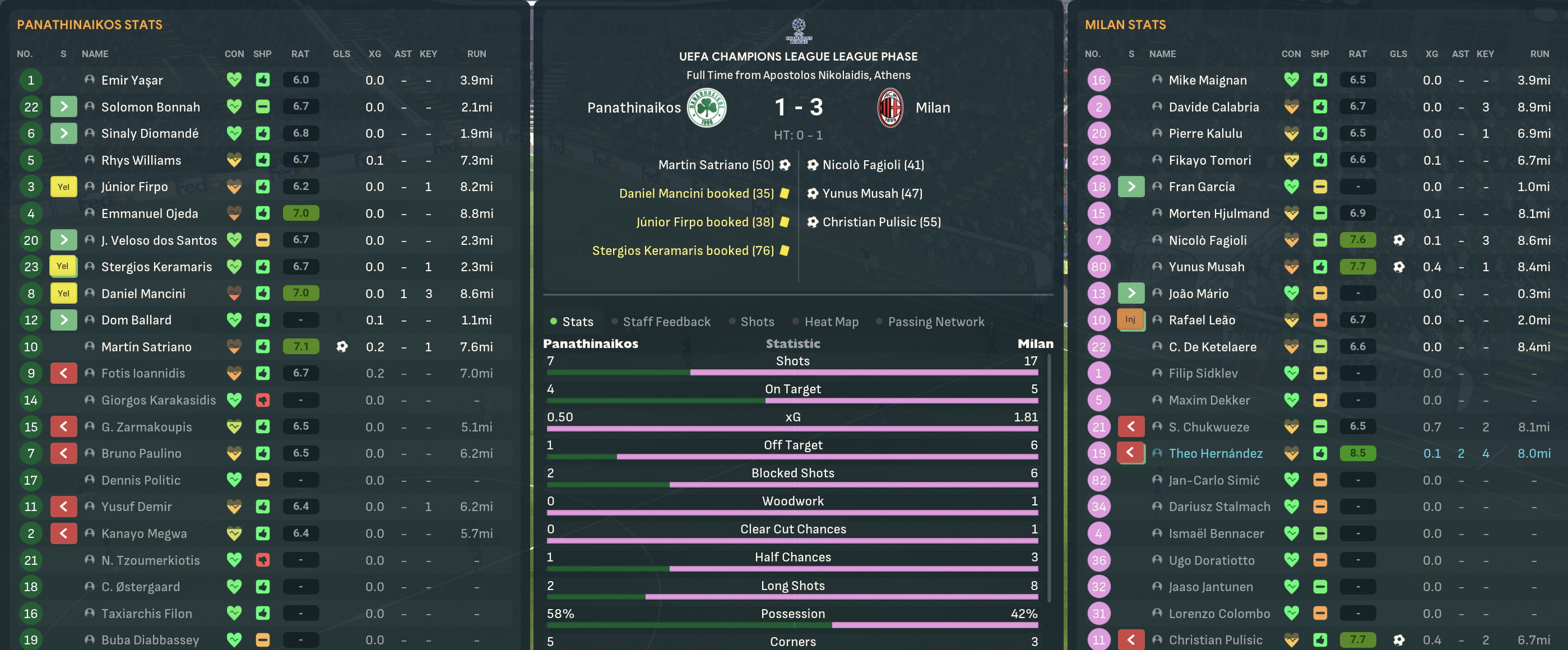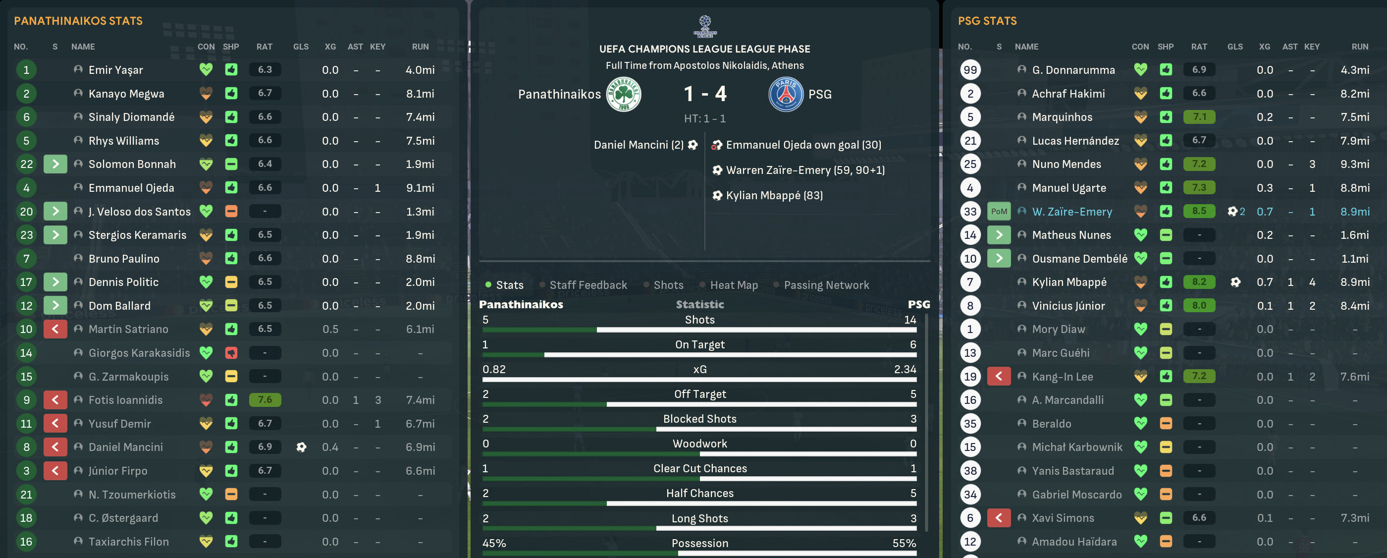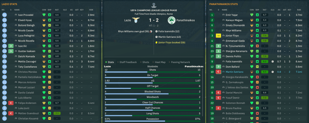 The bookies dished out some of the longest odds you’ll ever see, giving Panathinaikos a 10,000/1 chance of winning the Champions League. But they opened up with a dominant 4-1 win over Sparta with goals by Dennis Politic, Satriano, Ballard and Ioannidis. Their first big test took them to Lazio, where they caused a shock as Júnior Firpo’s excellent run and cross teed up Ioannidis’ opener. Lazio grew into it and equalised with a lucky own goal but Satriano’s excellent finish restored the lead. Politic and Ioannidis hit the post after the break and Lazio offered little as Mahtal’s side claimed a huge 2-1 scalp.