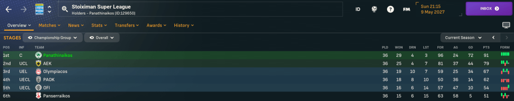 The title run-in began well as Politic scored twice in a 5-0 thumping of 4th-place OFI. Then Mahtal sacrificed a Greek Cup semi against AEK to beat them 2-0 three days later through Ioannidis and Mancini, which moved them nine points clear. That set the scene for Panathinaikos to stroll to their 23rd Greek title and their first consecutive titles since 1996.