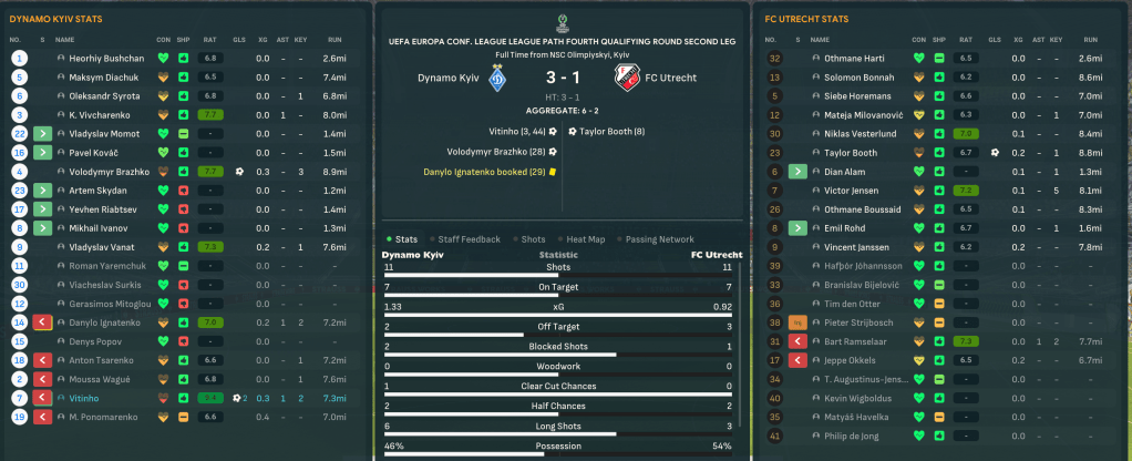 Mahtal needn’t worry about being knocked out of the Champions League on penalties this season as his Kyiv career began with the Europa Conference League second qualifying round. They breezed past Azerbaijan side Zina 8-2 on aggregate then Swiss side Luzern 6-2. Vanat scored twice in a 3-1 win at Utrecht before Vitinho’s brace secured their place in the league phase.
