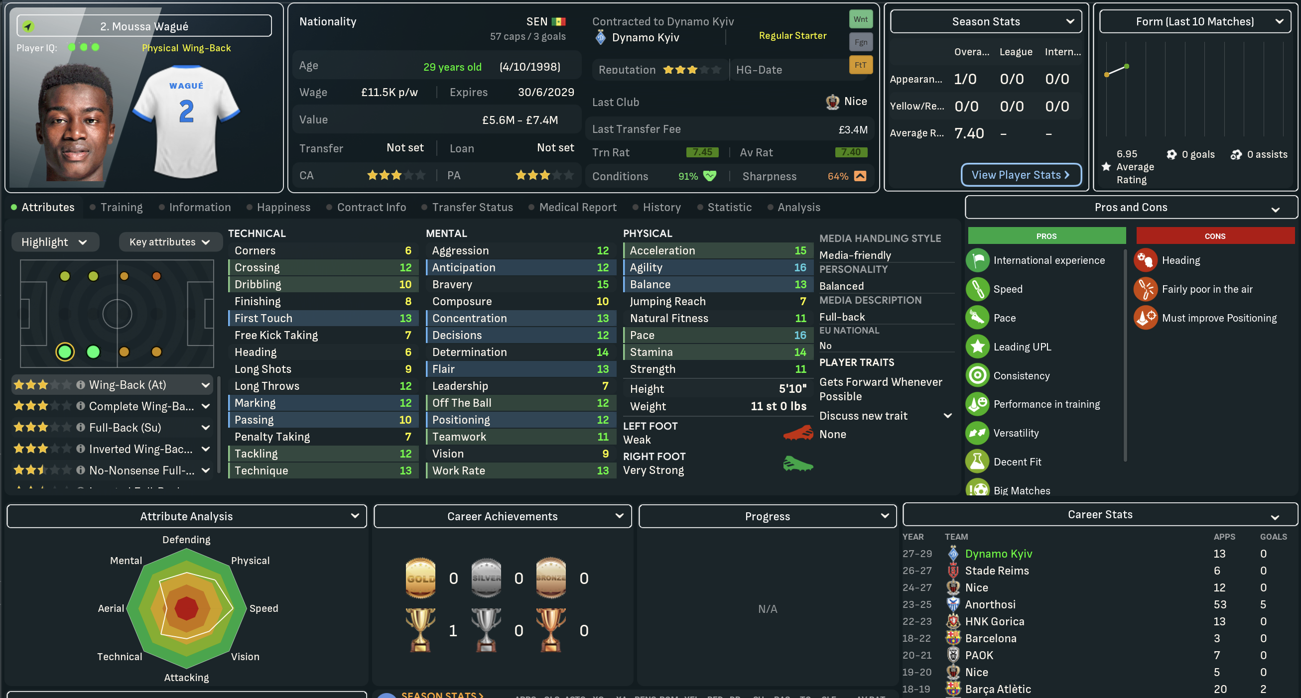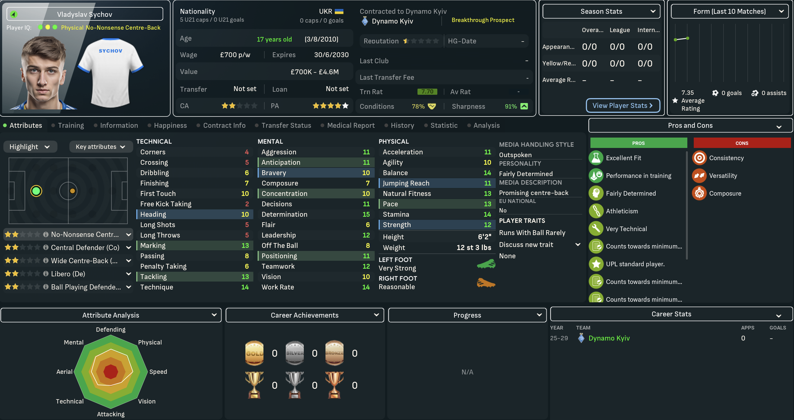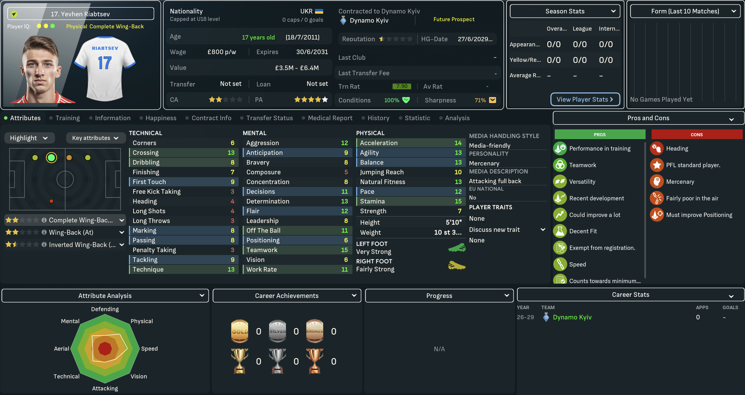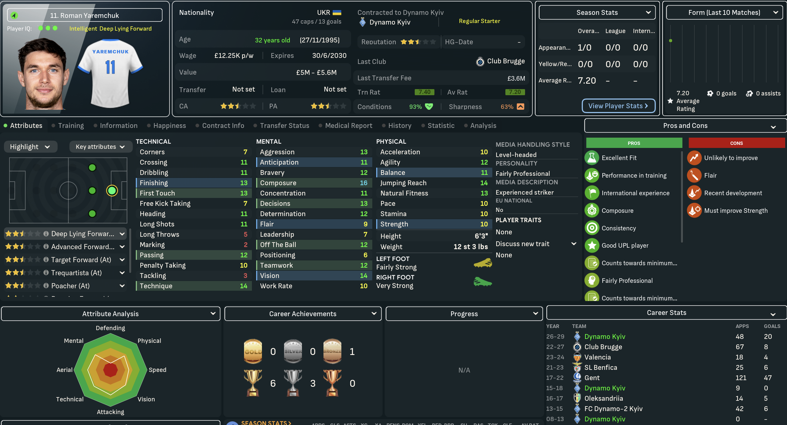 Dynamo has spent its entire history in the top tier of Soviet then Ukrainian football, establishing a fierce rivalry with Spartak Moscow in the 1970s. The club has won 16 titles in real life, adding two more during this save. But it’s one of only two Soviet clubs, along with Dinamo Tblisi, to win a European trophy, lifting the UEFA Cup Winners’ Cup in 1975 and 1986 and the UEFA Super Cup in 1975. So far in this save, Dynamo won VBet Liha in 2025 and 2027 with Shakhtar winning the other three titles.