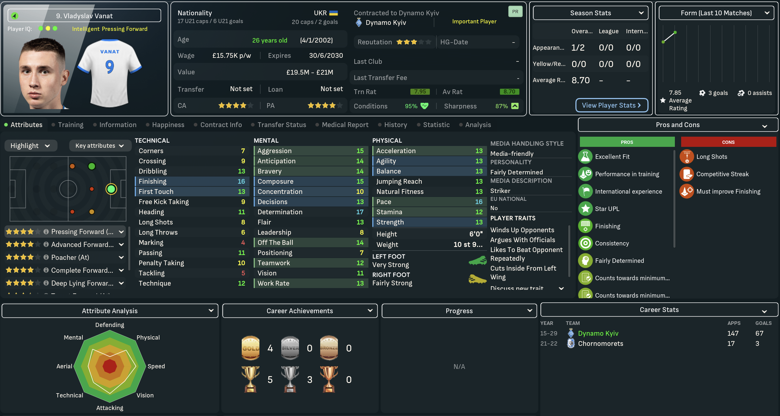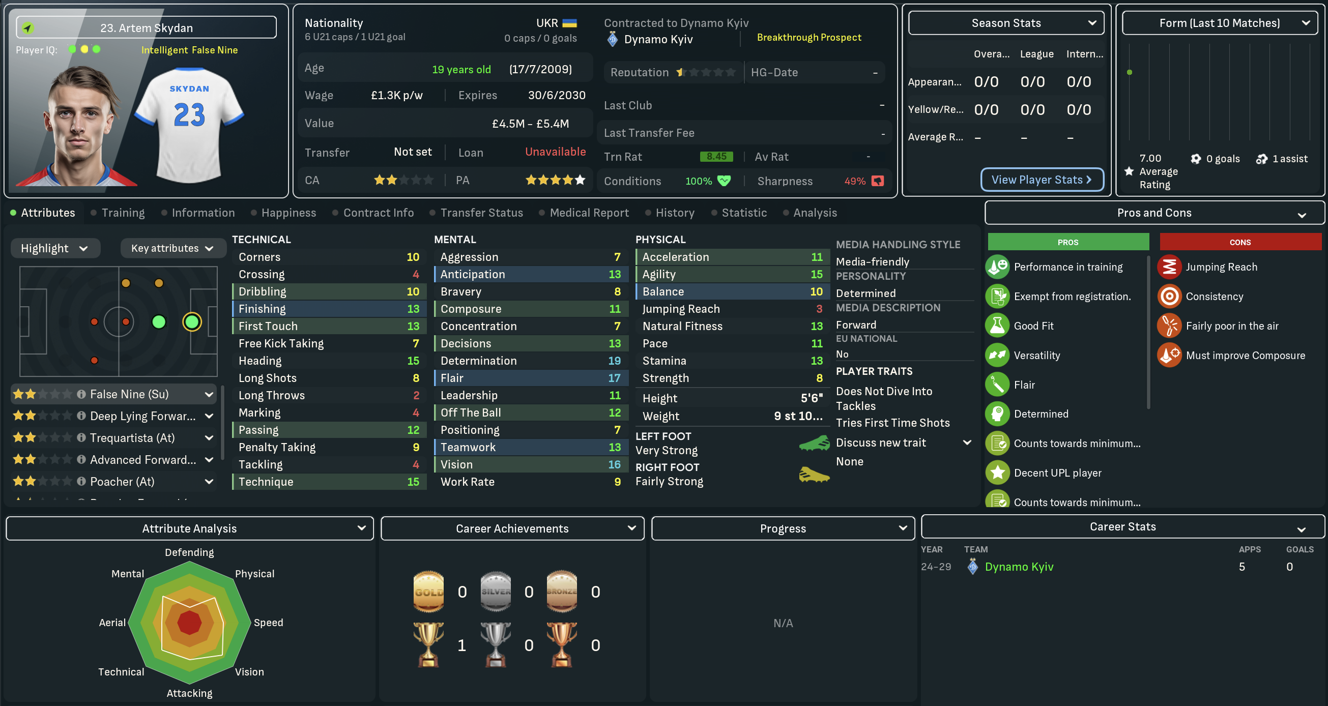 The best player at Dynamo is centre back Maksim Diachuk along with striker Vladyslav Vanat, midfielders Volodymyr Brazhko and Mykola Shaparenko, who suffered a fractured skull in training in late July, centre back Oleksandr Syrota, Brazilian winger Vitinho, striker Roman Yaremchuk and former Barcelona full back Moussa Wagué. Mahtal also had plenty of exciting youth prospects to work with, led by first-team strikers Artem Skydan and Mikhail Ivanov. They also had full back Yevhen Riabtsev and centre backs Vladyslav Sychov and Jhonatan Sánchez in the youth team.