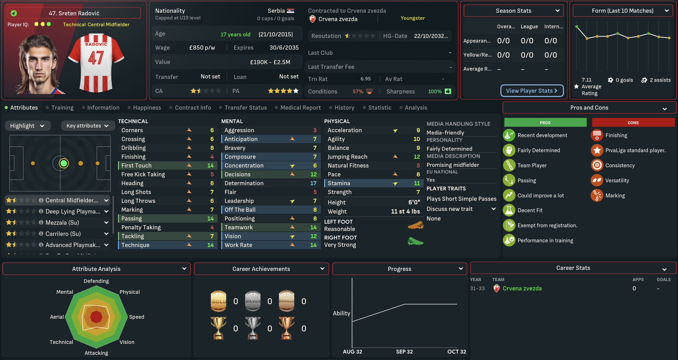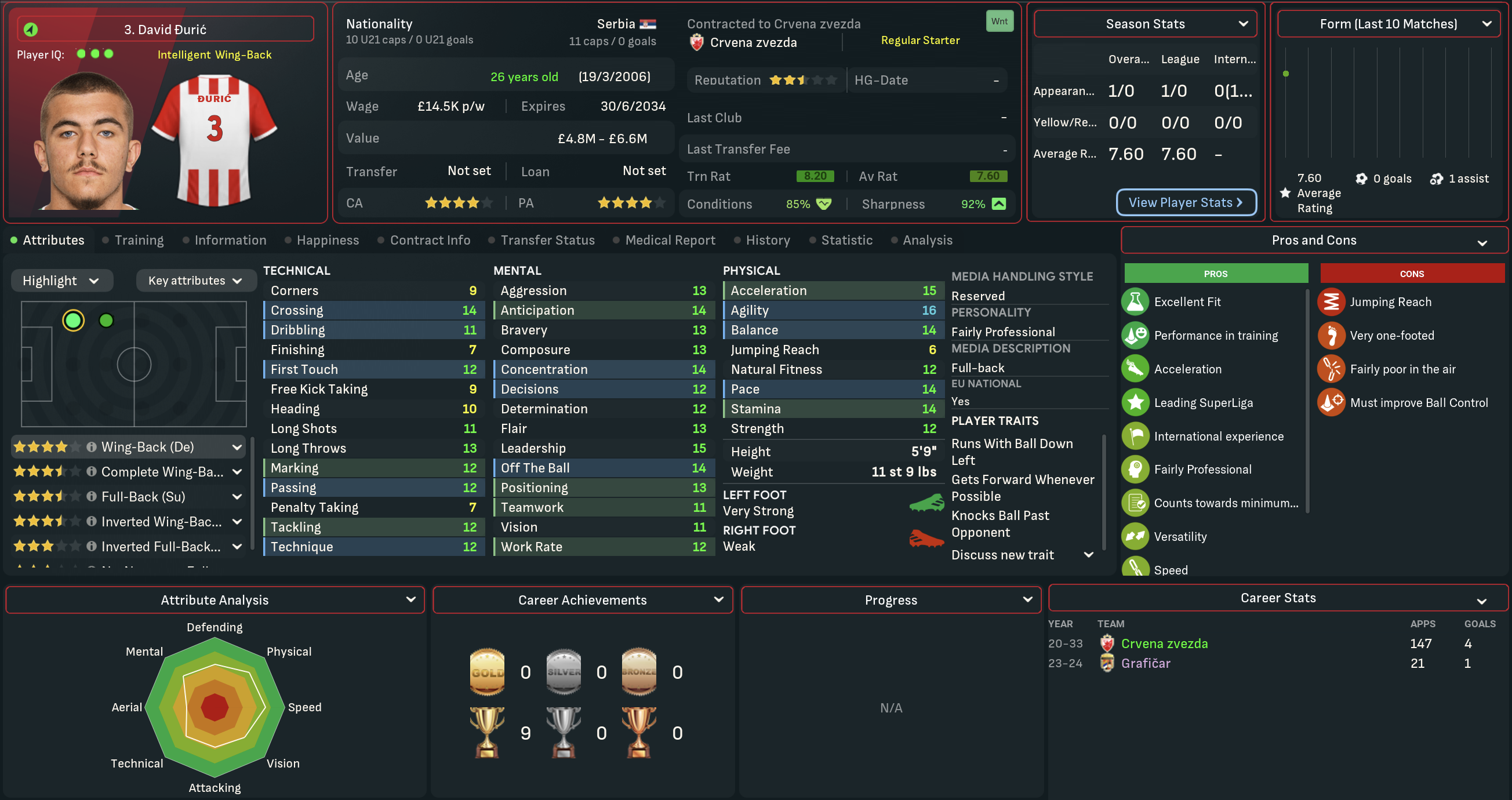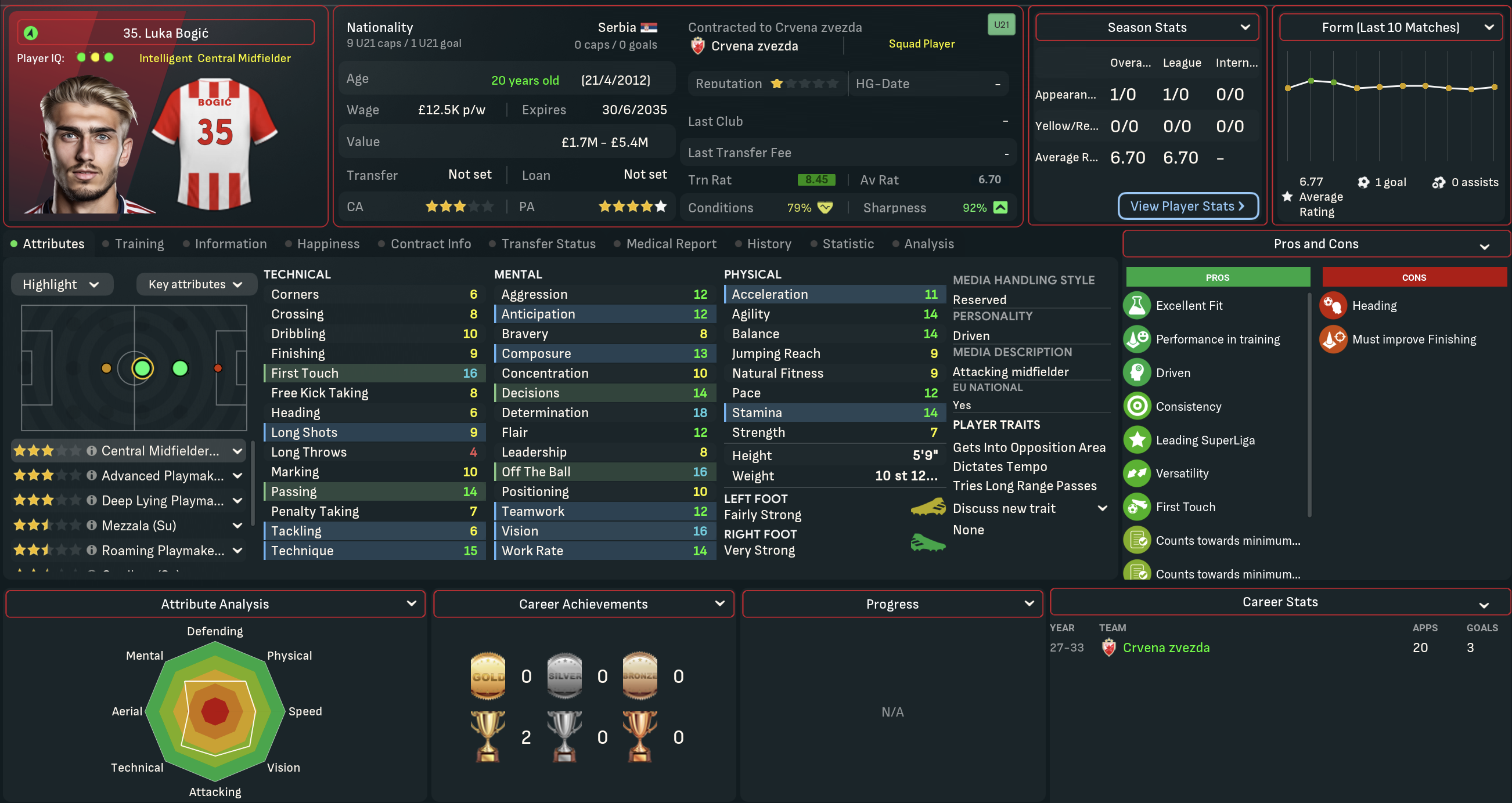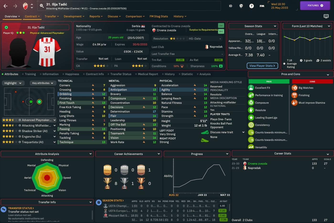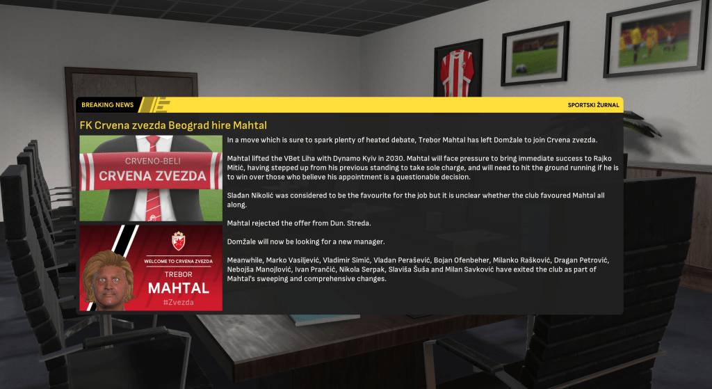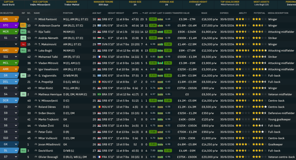 A domestic double is never anything to be sniffed at, so Mahtal was pretty content with his first season in Serbia. However, he felt there was still plenty of work to be done at Red Star. He wasn’t happy with the end-of-season form and the general lack of quality in attacking areas, but was excited about the potential of the club’s youngsters. So he went into the summer of 2034 optimistic about the opportunity to launch a rebuild mission to strengthen the squad he’d inherited.