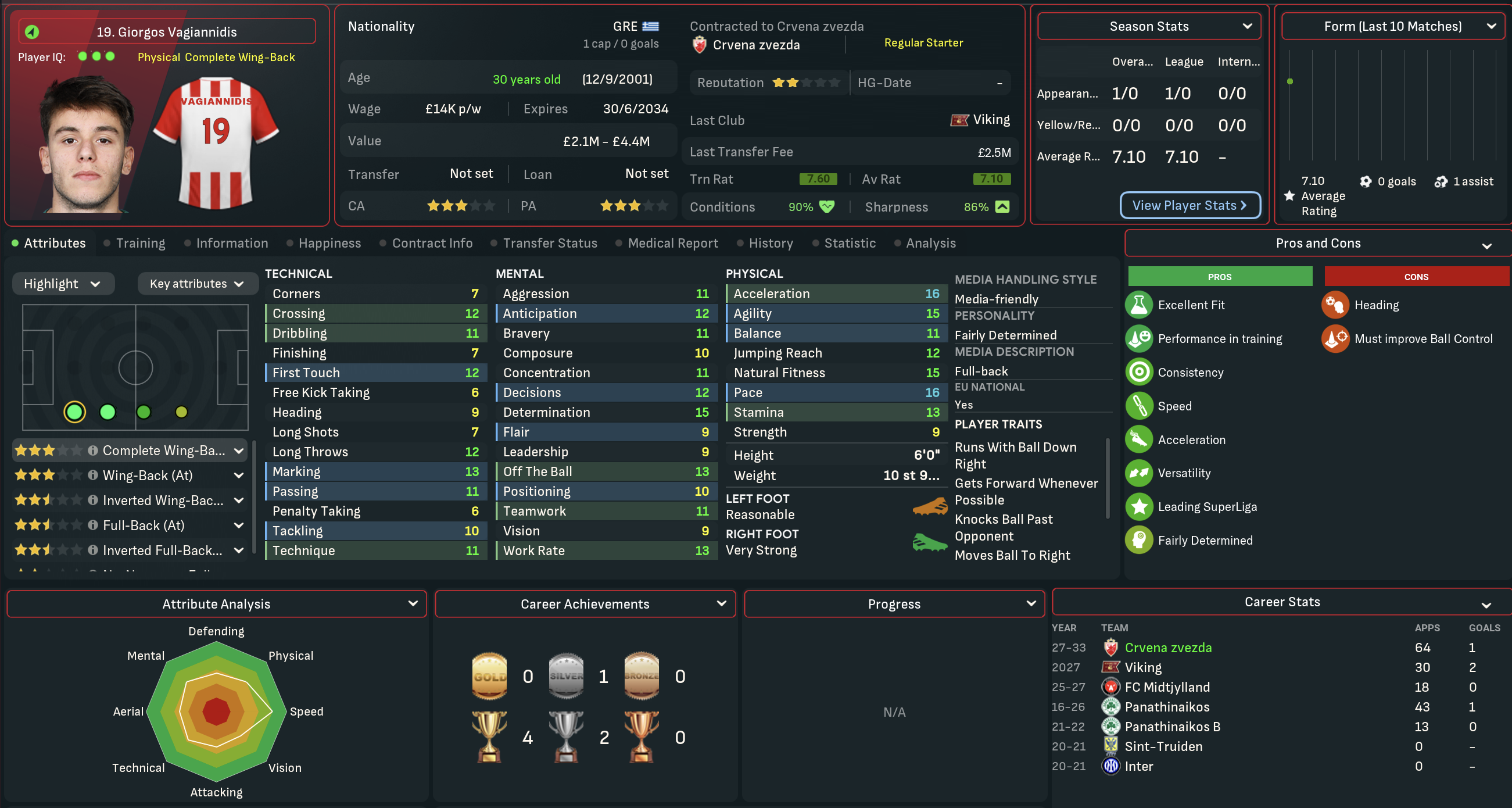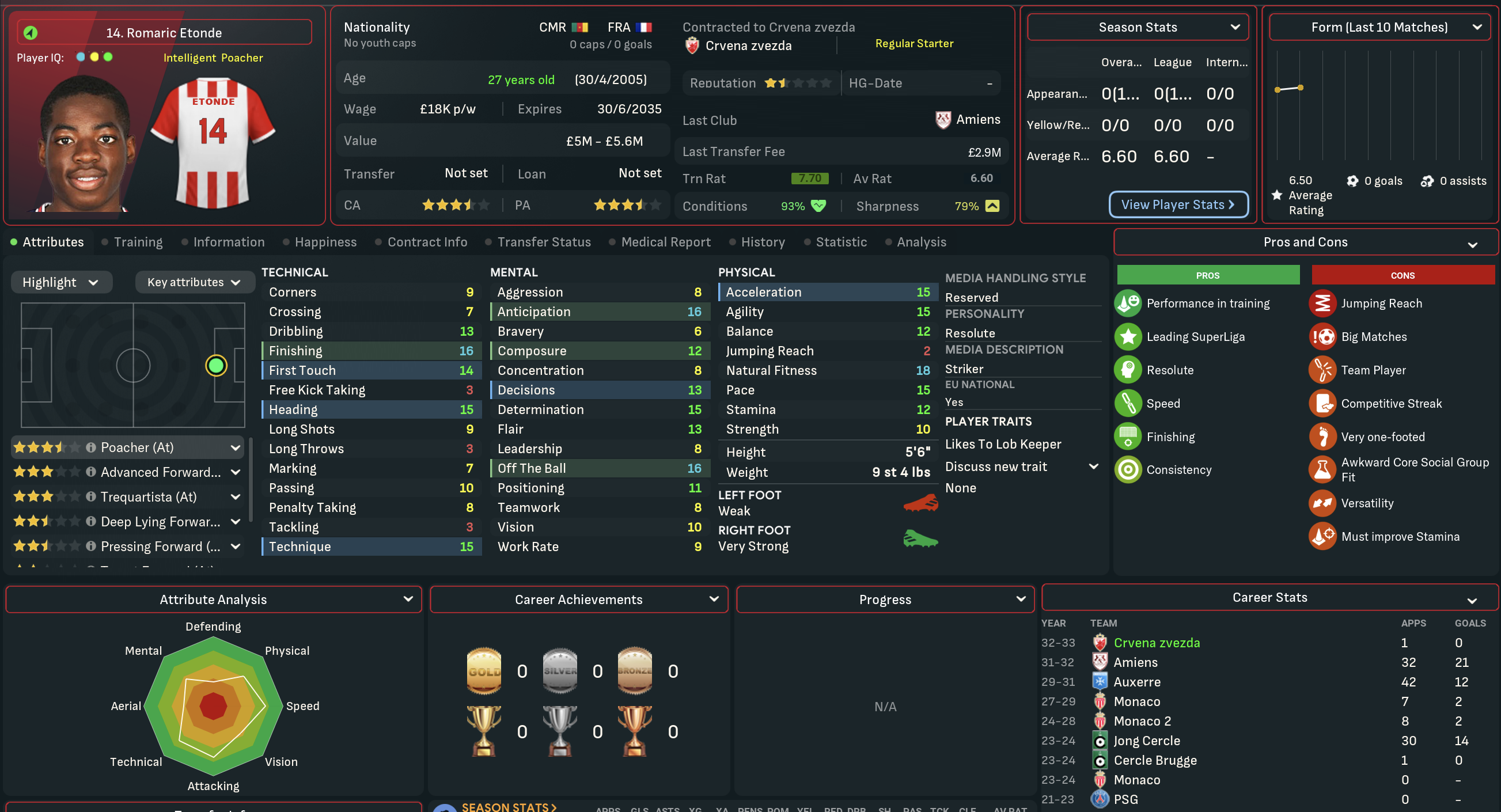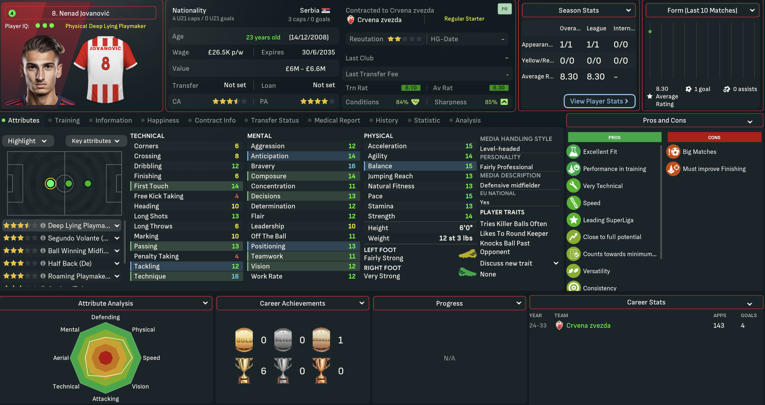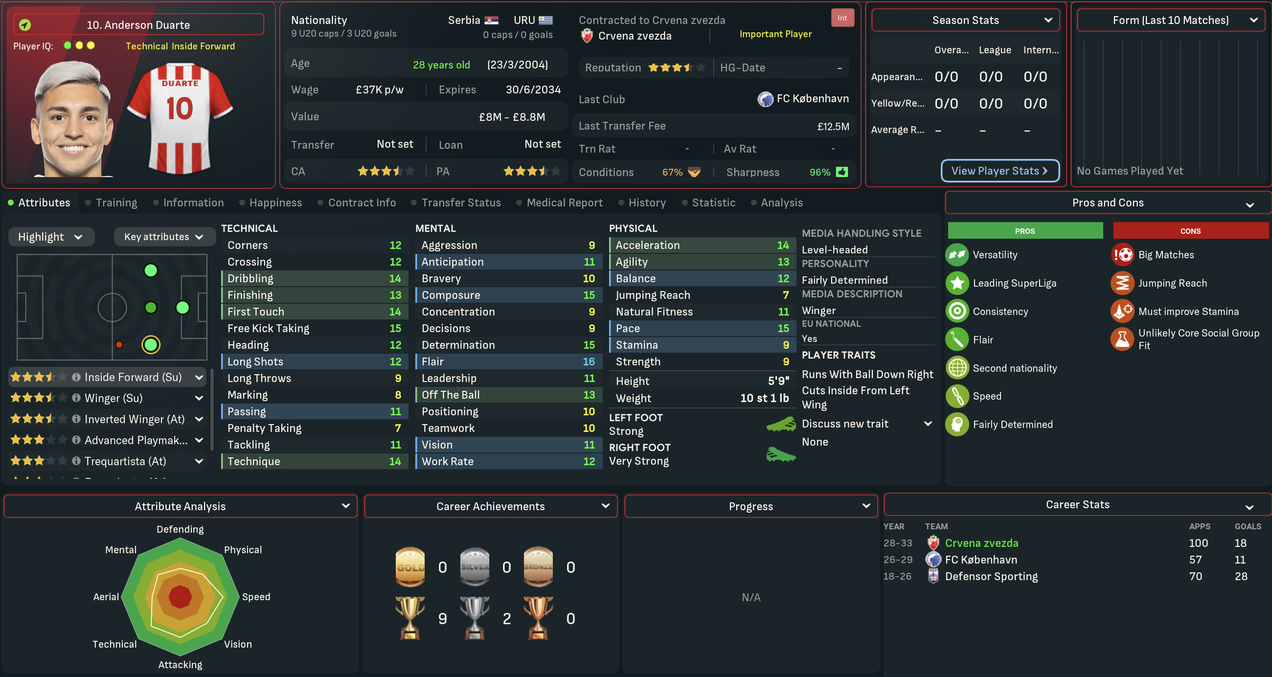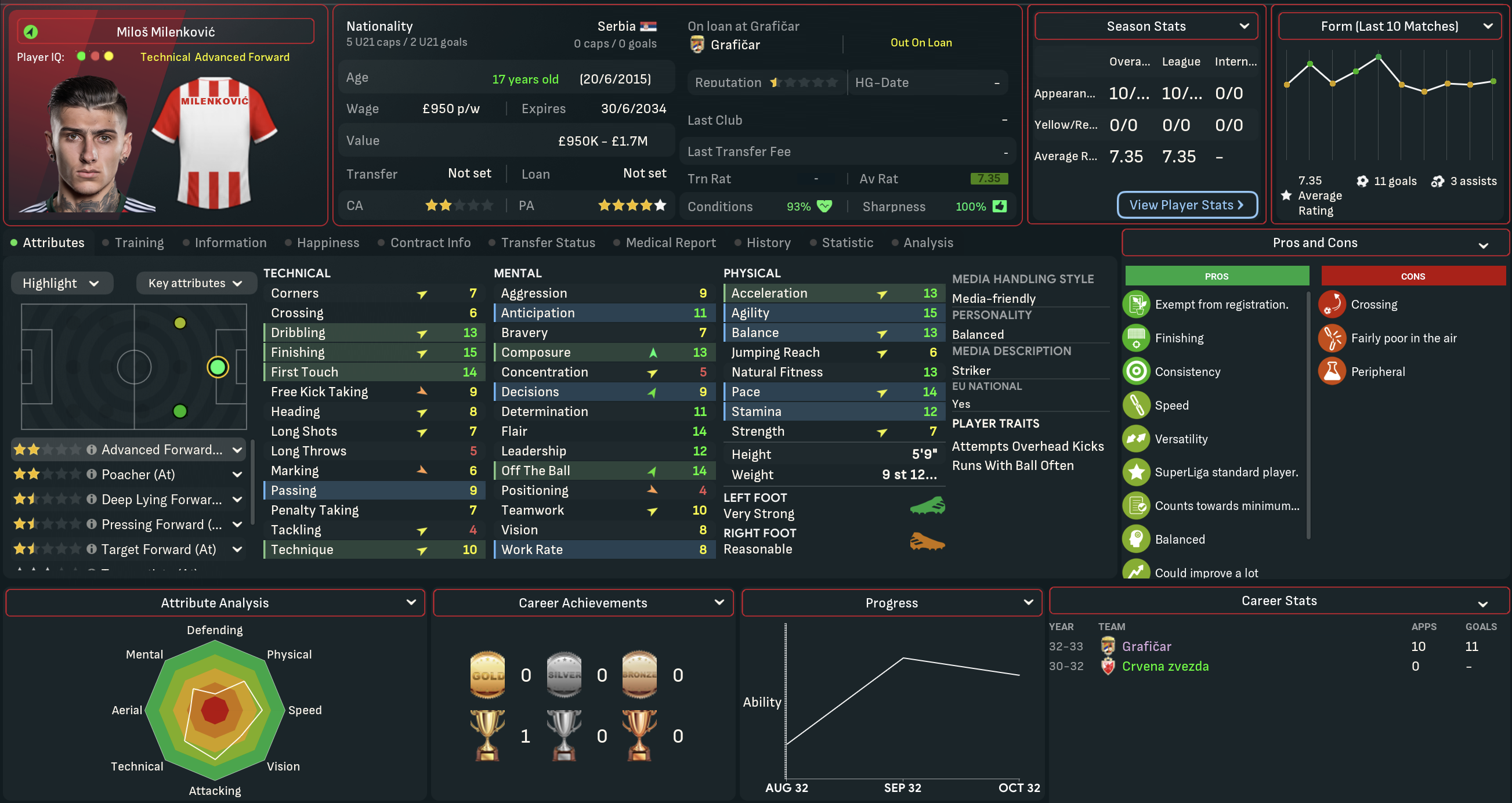 A domestic double is never anything to be sniffed at, so Mahtal was pretty content with his first season in Serbia. However, he felt there was still plenty of work to be done at Red Star. He wasn’t happy with the end-of-season form and the general lack of quality in attacking areas, but was excited about the potential of the club’s youngsters. So he went into the summer of 2034 optimistic about the opportunity to launch a rebuild mission to strengthen the squad he’d inherited.