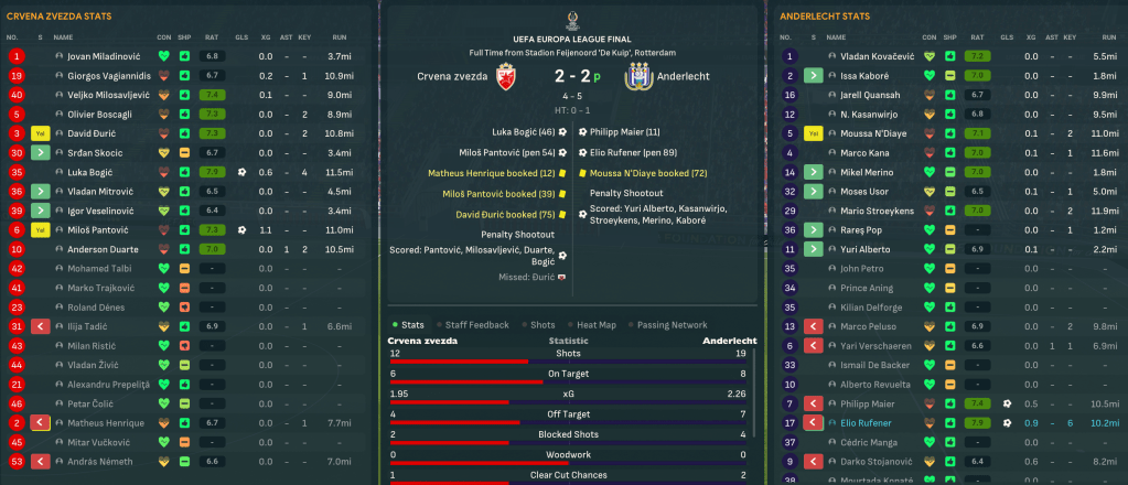 Anderlecht started the game brightly and took advantage of it from a near-post corner. Crvena zvezda offered nothing so Mahtal laid into them at half time. He got the desired response as Bogic finished off a nice move with a cool finish then Duarte won a penalty that Pantovic slammed home to put them ahead on 54 minutes. Anderlecht had the better of the last half hour but wasted chances until the referee evened things up with a shocking penalty decision on 88 minutes. From then on, it was obvious what was going to happen, and Anderlecht won 5-4 on penalties.