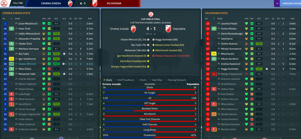 A week later, they had a chance to make up for the European defeat by taking on Vojvodina in the Kup Srbije Final. A poor first half was immediately forgotten as a moment of brilliance from Mitrovic, who turned and curled a beauty into the top corner. The midfielder scored again six minutes later, heading Veselinovic’s brilliant first-time volleyed cross home from close range and it was all over on 75 minutes as Tadic burst through two tackles to tuck the ball into the top corner. There was still time for Talbi to score off the bench and seal a dominant 4-1 victory to wrap up the Serbian league and cup double.