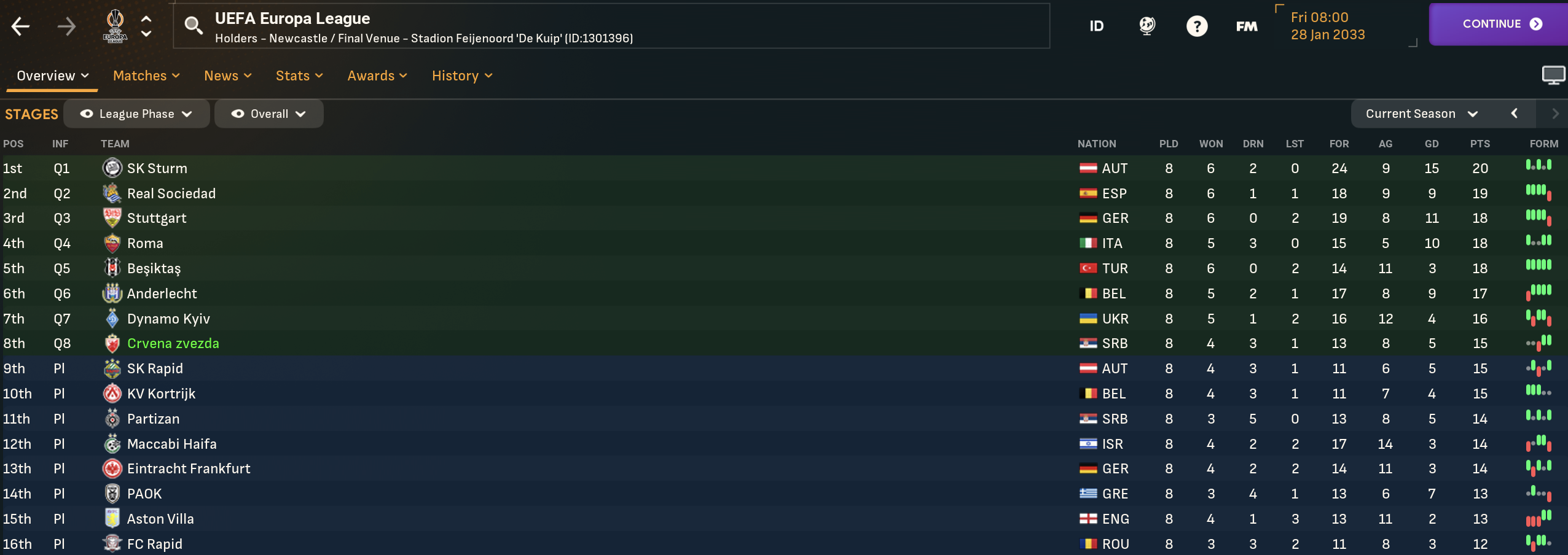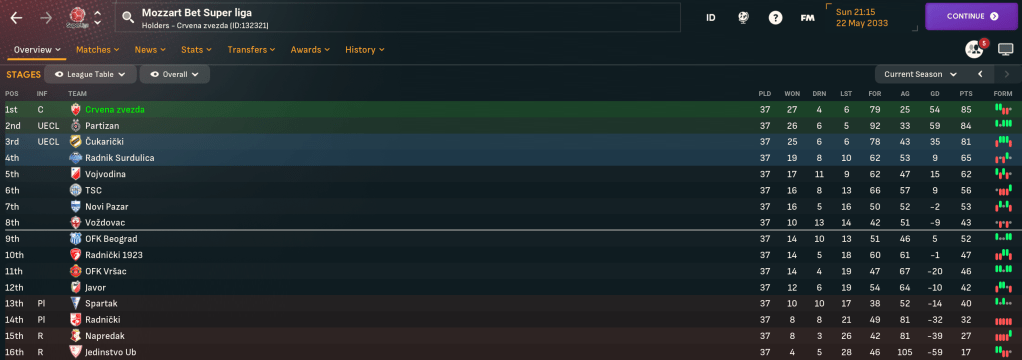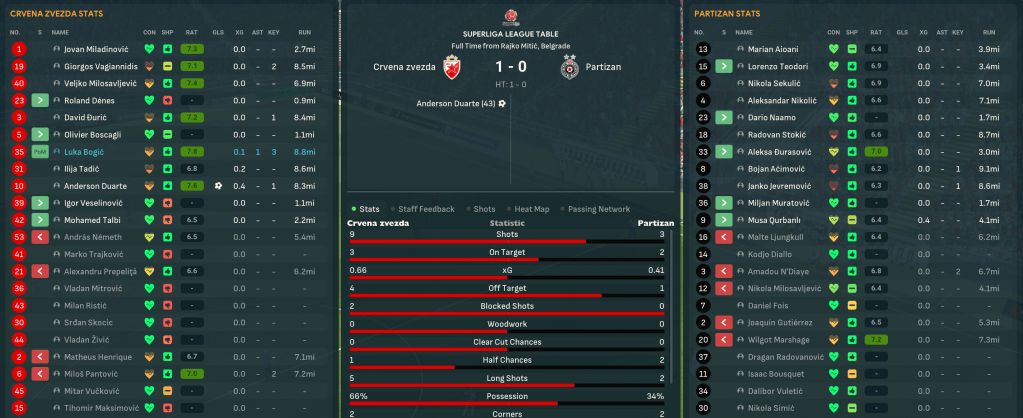 2033 began with Tadic’s brace inspiring a 4-1 thumping of Jedinstvo Ub. Next was a big game at 2nd-place Cukaricki, who scored early on but striker András Németh grabbed a deserved point late on. Veselinovic scored his first senior goal in a 5-0 win at Napredak before Prepelita powered home two headers to defeat Vrsac 4-0. A big game followed at home to rivals Partizan, which Duarte lit up with a wonderful solo goal that was the only moment of quality to open up an 11-point lead.