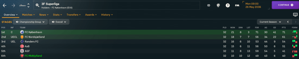 Mahtal allowed several older players to leave at the ends of their contracts at the end of 2035 and promote several youngsters in their place. But turning to youth did not start well as 2036 began as 2035 ended as they drew yet another match 0-0 at home to Vejle – that’s nine draws in 18 – then 2-1 defeats at Randers and København and at home to Brøndby had the board’s desire of a top three finish and even the top five looking in serious jeopardy. Djú eased some of the pressure with the only goal at rivals Viborg to at least confirm their place in the Championship Group.