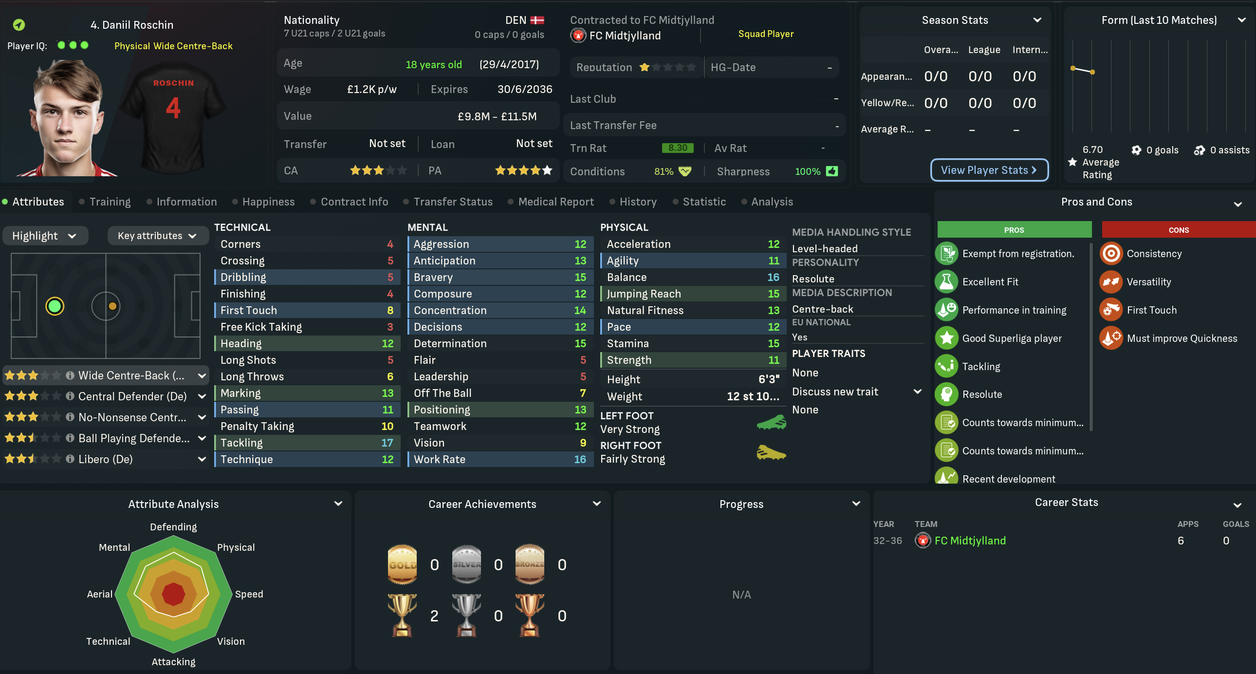 Midtjylland has a strong reputation for finding and developing players through its academy, attracting local players and foreign talent through its international network. However, it’s only won one title during this save, in 2028, and slumped to 6th last season. The club has £900k in the bank, a £1.2m transfer budget and £256k wage budget, of which £19k is spare. It plays at the 21,274-capacity MCH Arena and has solid infrastructure of 20 youth recruitment, 17 youth facilities and 16 training and youth facilities. Midtjylland competes in the Battle of the Heath Derby with Viborg and the Battle of Midtjylland Derby with Silkeborg, plus rivalries competitive rivalries with København and Brøndby.