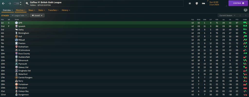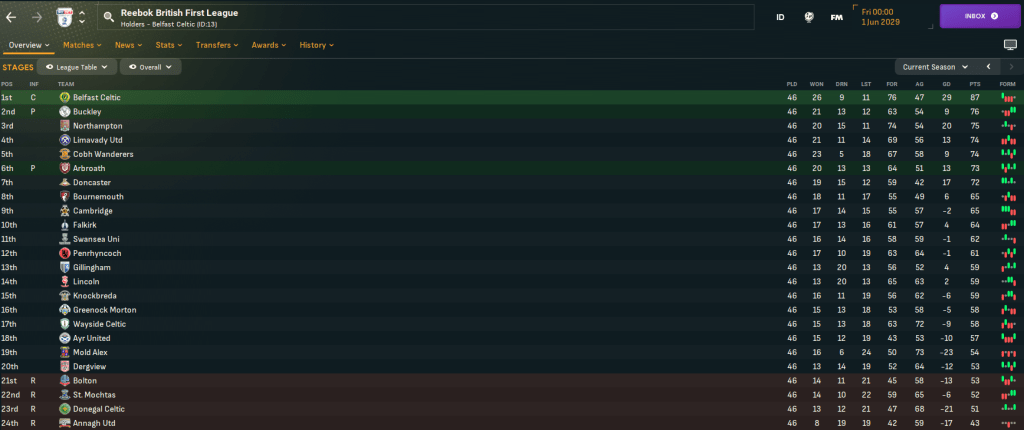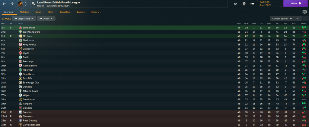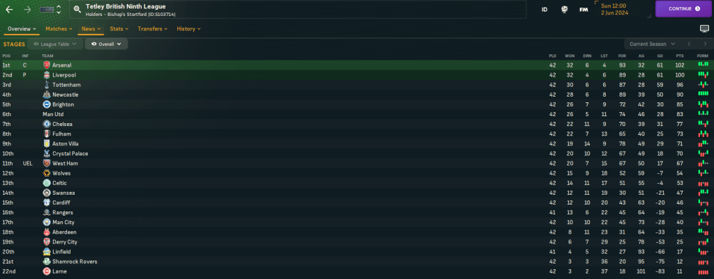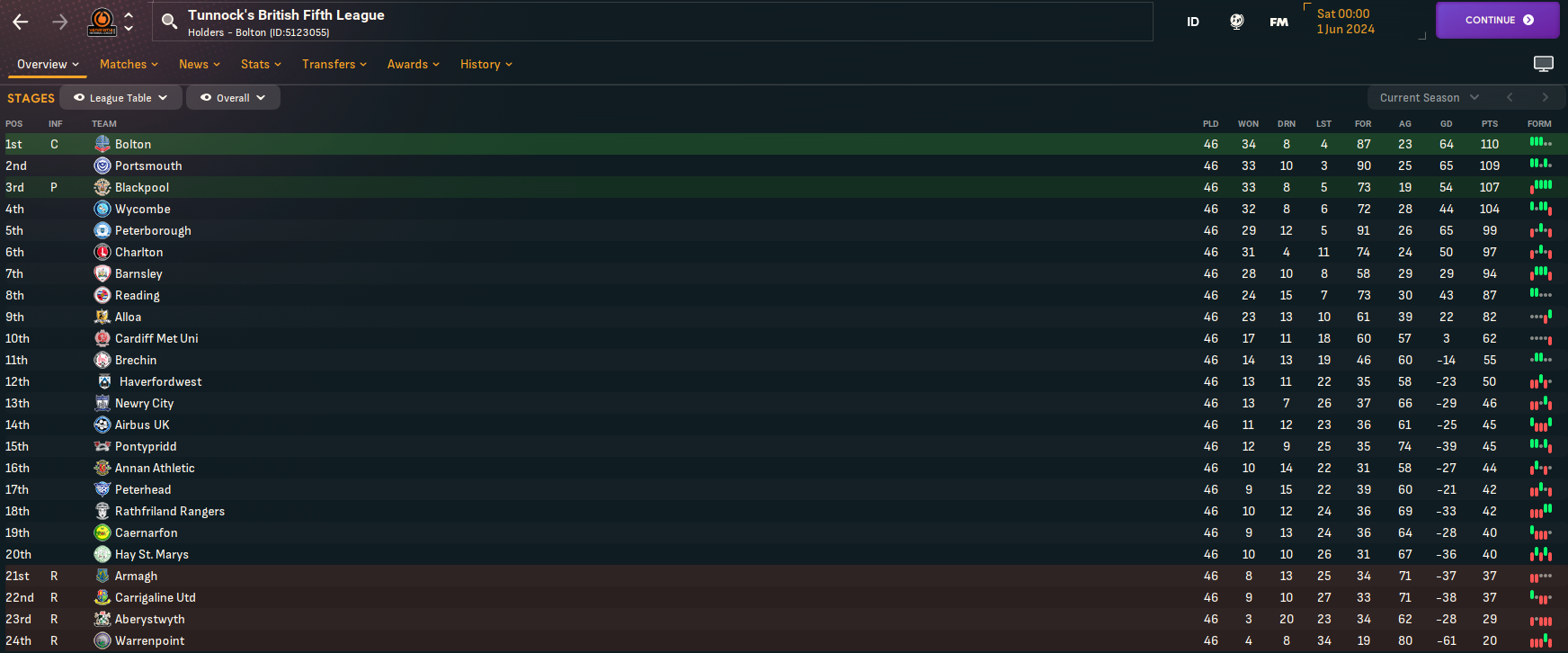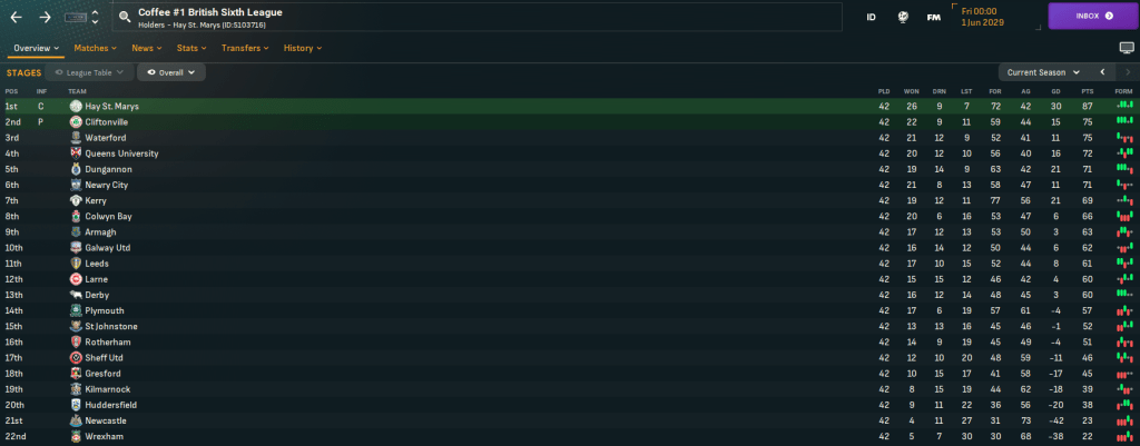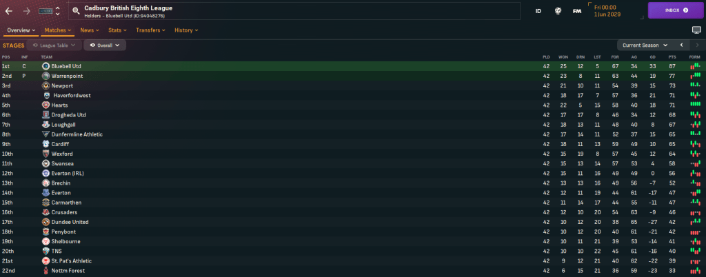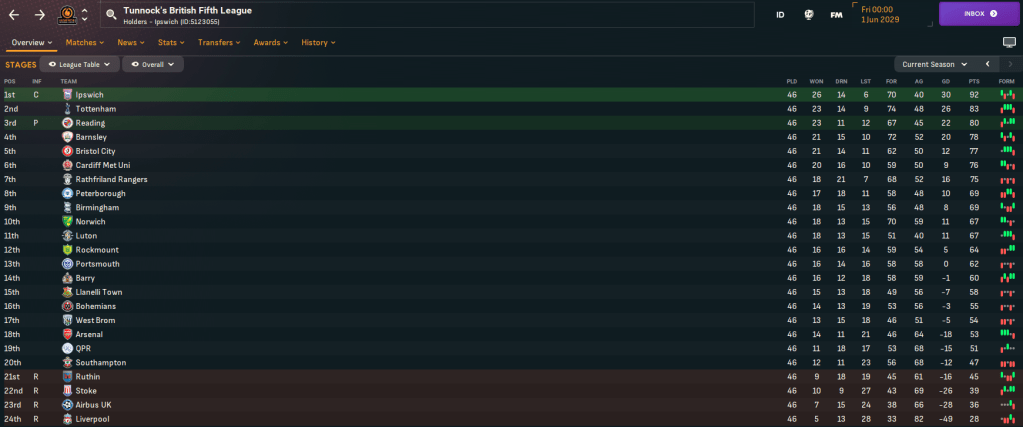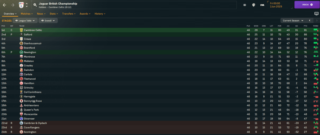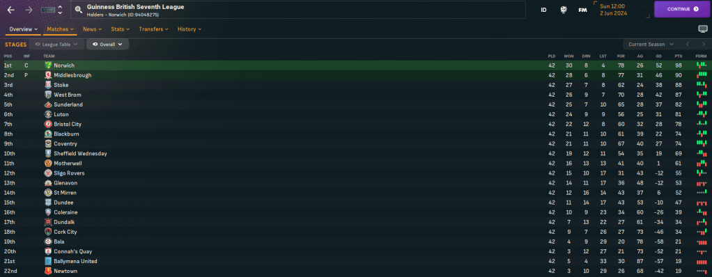The biggest strugglers at the bottom of the system include TNS, who I thought would do well given they had better finances than most teams at their level, Everton, who’re broken financially, Nottm Forest, Newcastle, Leicester, Ards and Wrexham. But the biggest of the lot is Man City, who just lost every match in League 9 and were in administration in November 2028. Things you love to see!