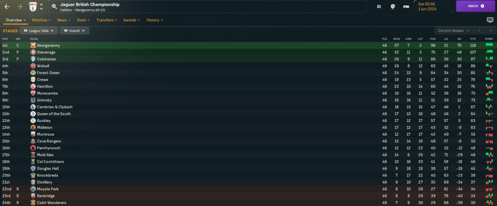 Moving down a league, there was more Welsh success as Abergavenny won the Jaguar British Championship with a phenomenal 118 points, only losing twice alls season. That was thanks to spending £67m on the likes of Kobbie Mainoo, Yaser Asprille and Jarrad Branthwaite. Stevenage were promoted with 107 points and were joined by Colchester, who beat Forest Green in the playoff final. But Moyola Park, Banbridge and Cobh Wanderers were relegated. Less money was spent, but Stevenage signed Conor Bradley for £17m and Abergavenny dominated with 9 of the 13 biggest transfers.