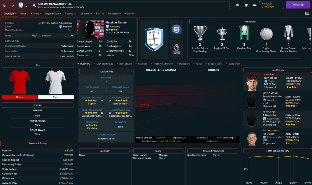 We’ll leave this post there, but I think I will sim ahead even further into the future to see if these British sides can begin to challenge Europe’s elite. I may also do a little FM Experiment managing a team in this database. For reference, Killester have £232m in the bank, perfect facilities and a £2bn valuation and look like the side best positioned to conquer Europe.