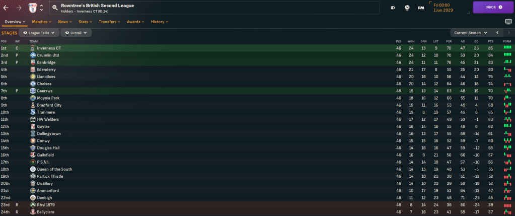 There was more good news for the non-British nations in the Rowntree’s British Second League. Inverness won the 2029 title and were promoted with Crumlin, Banbridge, who’d previously had back-to-back relegations, and Caersws, who beat Chelsea, who’ve held onto some of their big players like Caicado and Nkunku, in the playoff final.