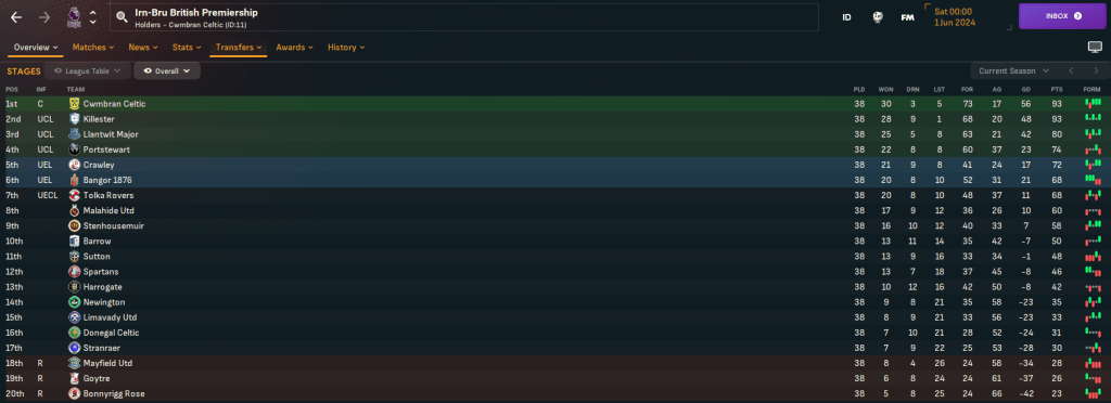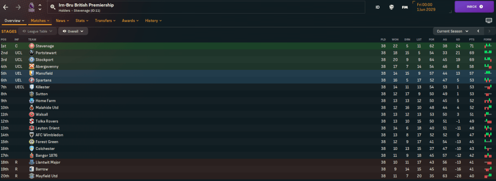Maiden champions Cwmbran seemingly struggled with European football as they dropped to 10th while Killester won the 2nd Irn-Bru British Premiership by 13 points from Tolka Rovers ahead of Portstewart and newly promoted Abergavenny. Portstewart won the title in season 3, nicking the title by 1 point from Killester with a low points tally of 74 ahead of Tolka and Wimbledon, who claimed consecutive promotions then reached the Champions League. Killester claimed the title back in 2027, winning it with just 70 points and only 1 point ahead of Wimbledon. A new champion was crowned in 2028 as Abergavenny rose to the top with 78 points ahead of Home Farm, Killester and Wimbledon. And another followed in the most recent season, as Stevenage won the league with just 71 points and 11 defeats from Portstewart, Stockport and Abergavenny. Pleasingly, only 9 of the 20 top-tier sides are English, and Barrow got relegated with Llantwit and Mayfield.