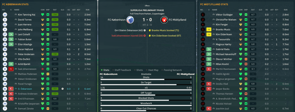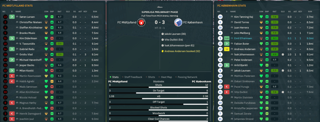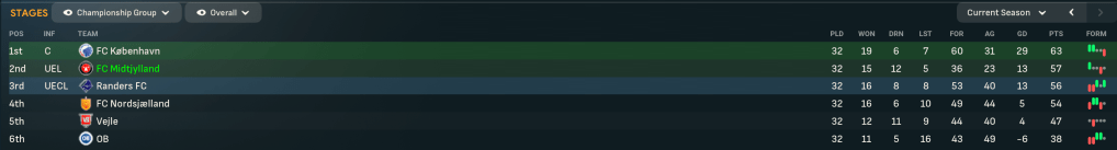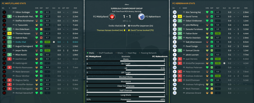 Game 3: København (1st, home): Three days later, victory for København would clinch the league and a draw would virtually guarantee it. København started the game brighter and took advantage, but Midtjylland grew into it and good play by Backs teed up Vlad’s equaliser just before half time. The visitors probably edged the chances but neither side created any more major chances. So they remained six points clear with two games to go.
