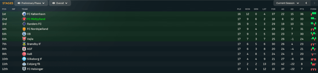 S Kirchheiner made his debut in the first game of 2037 and inspired his side to a clean sheet as a Høvenhoff penalty edged AaB 1-0. At the same time, København lost at Esbjerg, which saw Midtjylland move level with them. They backed that up with a big 3-1 win at 3rd-place Nordsjaelland, courtesy of wingers Juul, Backs and Winther, and kept pace with København. However, the perennial champions had far too much for them on the final day of the regular season, ahead of which goalkeeper Viktor Guldager got injured and Agrebi was harshly forced into his league debut.