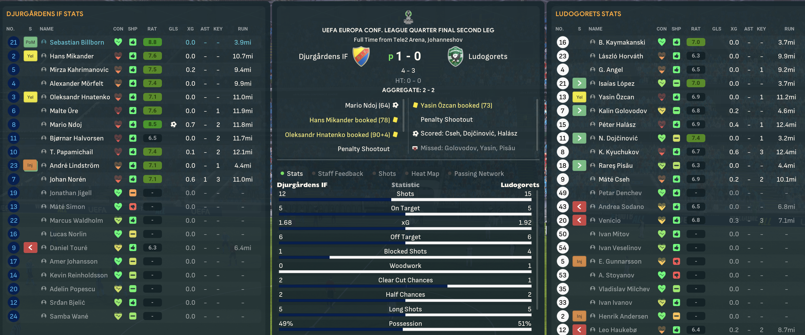 Next up was Ludogorets and midfielder Mario Ndoj’s late goal rescued a 2-1 deficit in Bulgaria and that proved crucial as Ndoj scored the only goal at home. Norén missed two big chances in extra time as Billborn denied Ludogorets several times to force penalties. It wasn’t looking good as Djurgården’s best two attackers Halvorsen and Norén missed the first two penalties. However, that man Billborn rescued them by saving Ludogorets’ third and fourth penalties. Both sides scored their fifth, Lindström converted and Billborn confirmed his hero status by saving again to send his side into the semis.