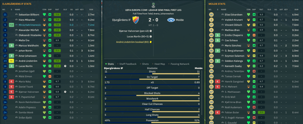 An all-Scandinavian affair in the last four saw Djurgårdens take on Molde while Mahtal’s former club Domzale faced Grasshoppers in the other semi. The first leg was a pretty poor game in which the only action of note was striker Daniel Touré being taken out, and Halvorsen converted the penalty. That was until the 94th minute when Lindström made a great run down the left and whipped in a cross for makeshift striker Norlin to double the lead with a looping header. Billborn was the hero again as he made seven saves to hold Molde to a 1-0 victory that sent his side into a surprise maiden European final.
