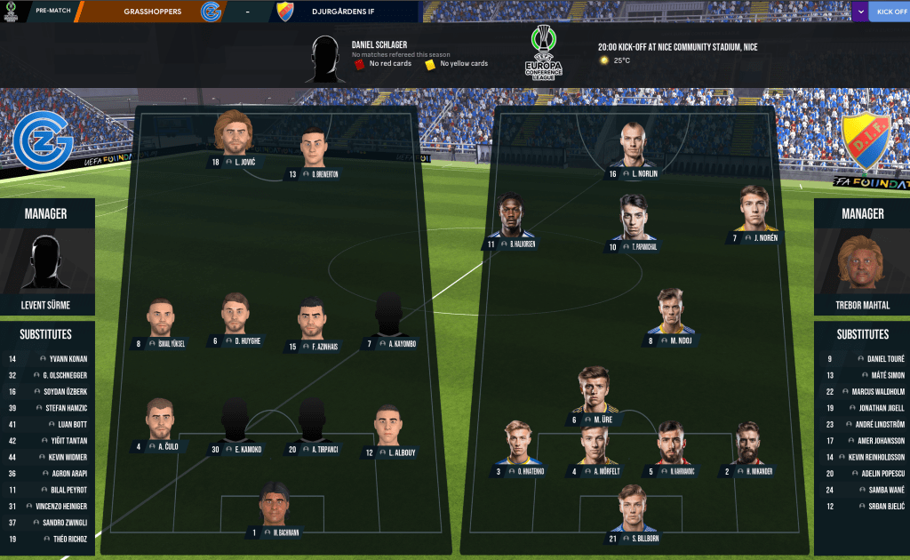 Few people would have predicted Djurgårdens to face Grasshoppers, who breezed past Domzale 5-0, for the chance to win a European trophy. Fans from Sweden and Switzerland descended on southern France to the 42,000-capacity Nice Community Stadium hopeful of a surprise piece of silverware. Mahtal had no injury concerns and his big selection headache was who to play up front. And he lined up: