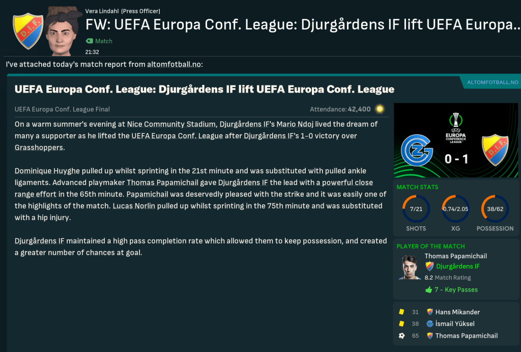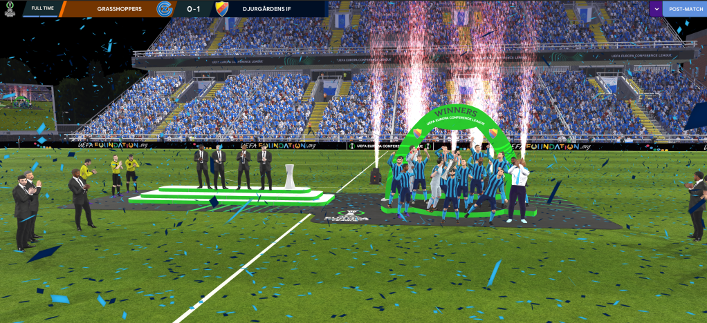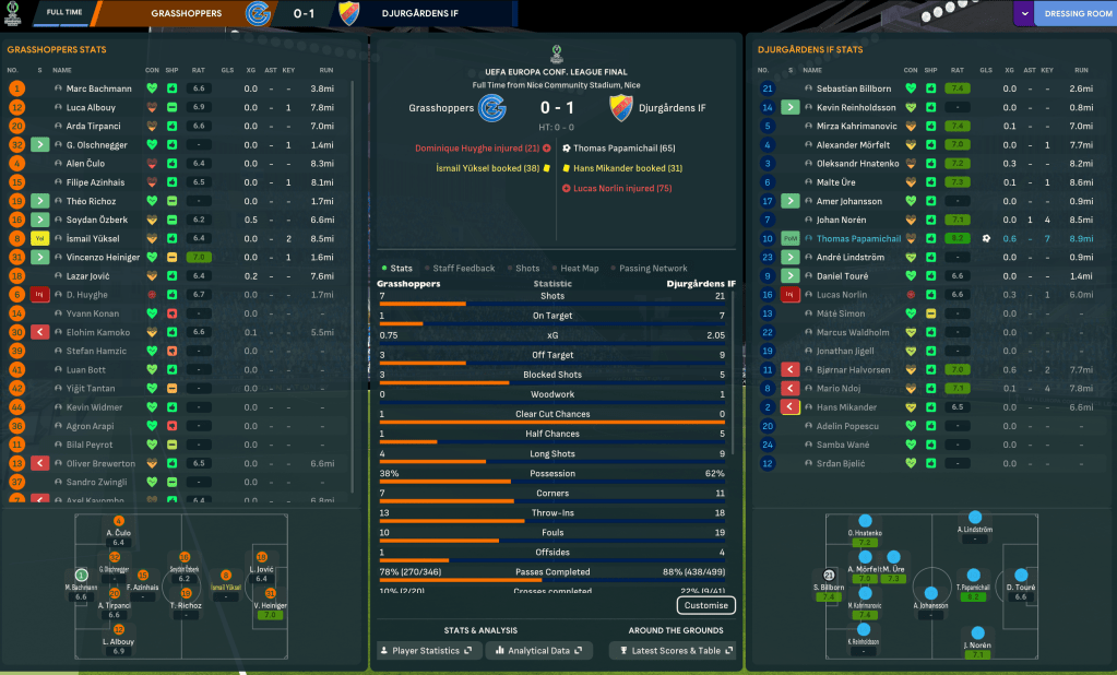 Djurgårdens dominated the first half by 10 shots to two but wasted several opportunities. That trend continued after the break until Norén found Papamichail midway inside the Grasshoppers half, he drove at the defence and curled home the opener with his left foot. The Swedes continued to boss the game, with the Swiss only mounting a threat as they forced a decent save out of Billborn in the final moments. But Djurgårdens held on for a famous victory. Djurdårdens IF won the Europa Conference League!