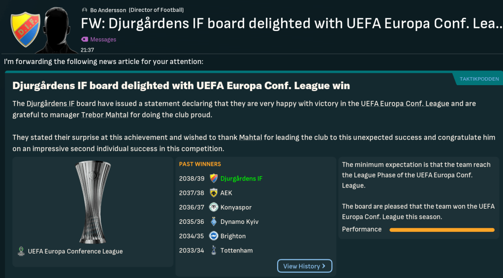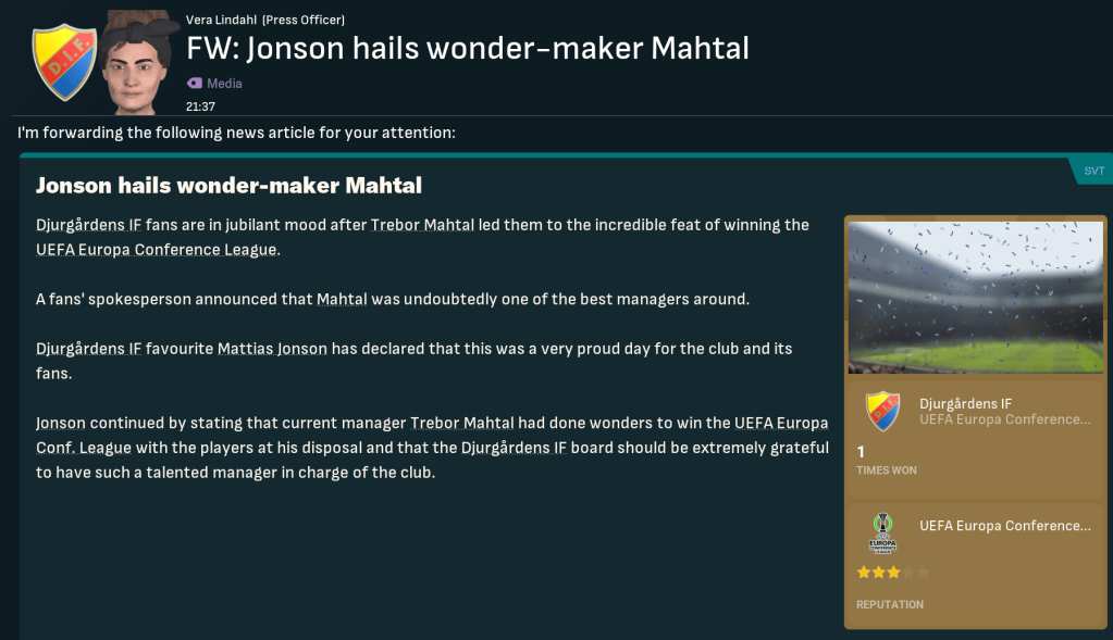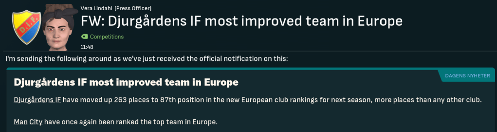 Usually after winning a title, Mahtal would dust his hands of a team and look for opportunities elsewhere. However, he’d definitely developed an affinity for Djurgårdens and was very excited about some of the prospects he had coming through. So he decided to stick with the club to lead them into the Europa League (which had already kicked off at this stage) and look ahead to the Champions League football their title delivered.