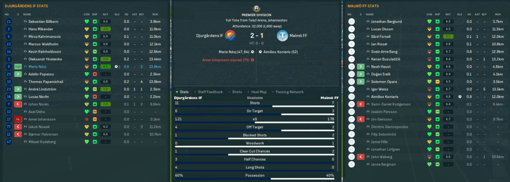 The bottom two were dismissed with ease before putting four past Sirius and Östers and Nowak got his first goal in a 2-0 win over Hacken to move 2 points behind Malmö with 10 games remaining. That teed up a big game as they hosted Malmö in late August. The first half was cagey but the sides exchanged goals in the first five minutes of the second. It looked to be drifting to a draw until Lindström beat two men then teed up Ndoj to smash home his second and swing the title in Djurgårdens’ favour.