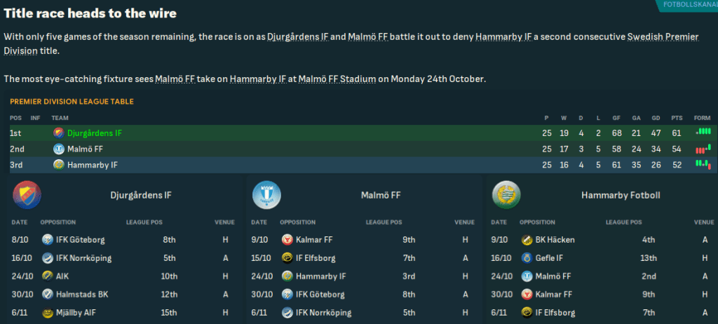 Game 2 – IFK Norrköping (4th, away): A much tougher game saw the leaders stumble with a 4-1 thumping led by Norrköping’s striker bagging a 21-minute hat trick. Malmö and Hammarby closed in with victories, reducing the gap to 4 points with three games to go.