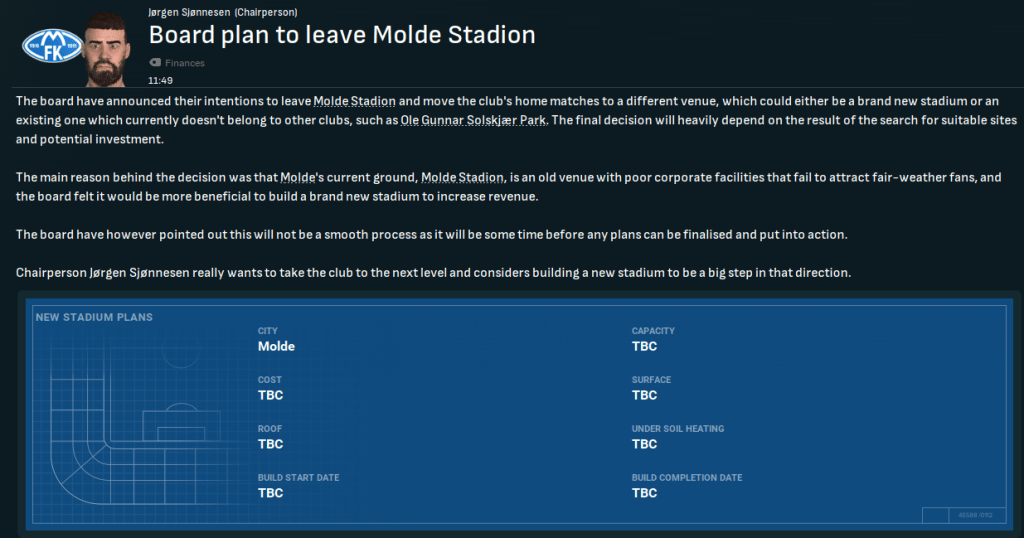 The winter break began with some odd news as newly elected chairperson Jørgen Sjønnesen announced plans to leave Aker Stadion. That could mean a new stadium or a move to an unused stadium, such as the council-owned Ole Gunnar Solskjaer Park, which was built in 2040.