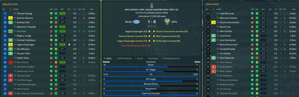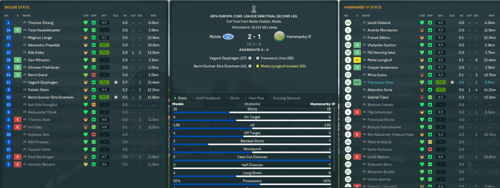 Molde breezed through the league phase and began 2043 with a last-16 clash with Cukaricki. Annoyingly, he was only allowed to add three more players for the knockouts, so some signings had to miss out. A wild first leg in Serbia saw striker Bernt Gunnar Siira Sivertsen grab a 3-3 before Edøy and striker Vegard Djuphagen earned a 2-1 home victory. Elsewhere, Mahtal’s former Danish rivals Häcken blew the competition wide open by knocking out Real Betis 4-3. That created a very open draw as Molde drew Finnish side KäPa, the winner of which would face Häcken or Hammarby in the semi, while Vålerenga or Iraklis would face Lugano or Olympiacos.