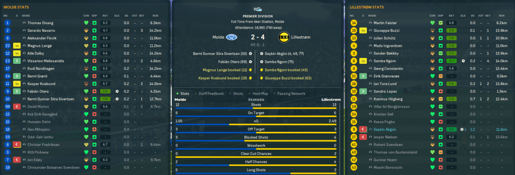 They finally got a week off so Mahtal treated the squad to a five-day break. That seemed to work as his side thumped Moss 4-0 with goals by Muñoz, Nordhagen, Kvalsund and Dalby then Ullern 5-1 led by Kvaslund’s hat trick. That sent Molde onto a superb run of seven wins in eight games, which left them just one point back from Lillestrøm with eight games remaining. That teed up a big top-two clash at Molde Stadion, which Molde completely blew by allowing the visitors to score their first two shots on target then, having fought back, allowed them to score their and fourth shots on target. And Mahtal was raging.