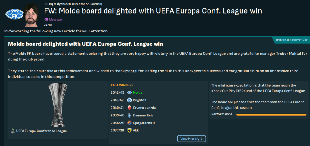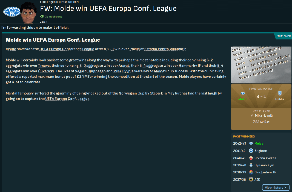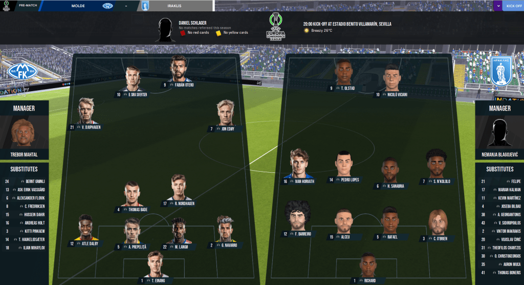 Mahtal absolutely loved the Conference League, having won it with both Dynamo Kyiv and Djurgårdens and been runner-up with Slovan Bratislava. This time, his Molde side’s first-ever European Final saw them take on Greek team GS Iraklis Salonika, who kept trying to buy his players following a tycoon takeover in 2035. 60,000 fans from Norway and Greece descended on the Spanish city of Sevilla for the Final at Real Betis’ Estadio Benito Villamarín. Mahtal had no injury concerns so lined up:
