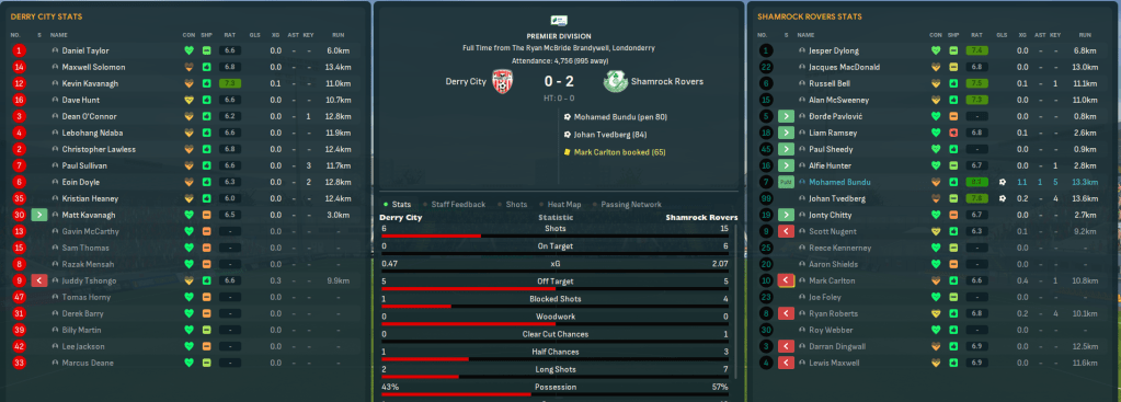 That put Shamrock within touch of the title ahead of a trip to Finn Harps. Roberts scored twice in the first half to lead a 4-1 win. The next day, Bohemians lost for the first time in four months to hand their rivals an 8th successive title! They broke the league records for most points and goals, racking up 93 points after 30 wins, 3 draws and 3 defeats, and scoring 96 and only conceding 23. Nugent equalled the league record for most goals with 24 in 27 and Carlton led the way with 13 assists.