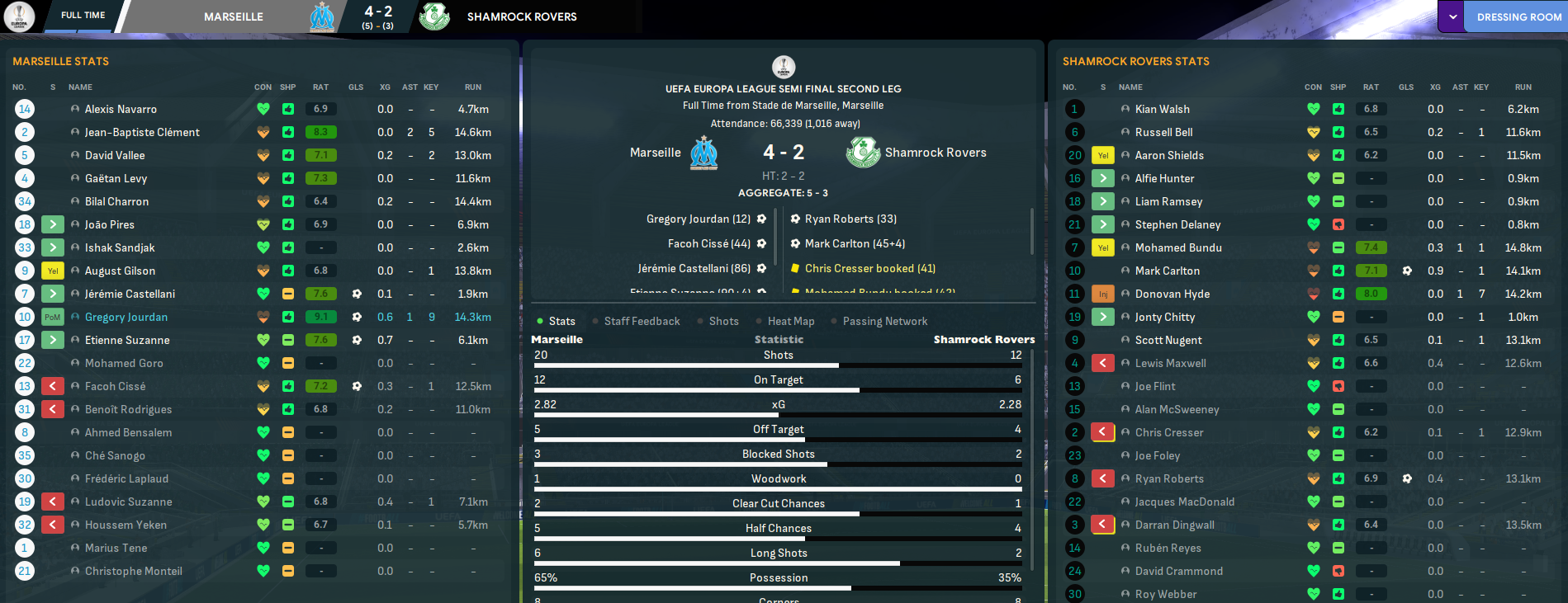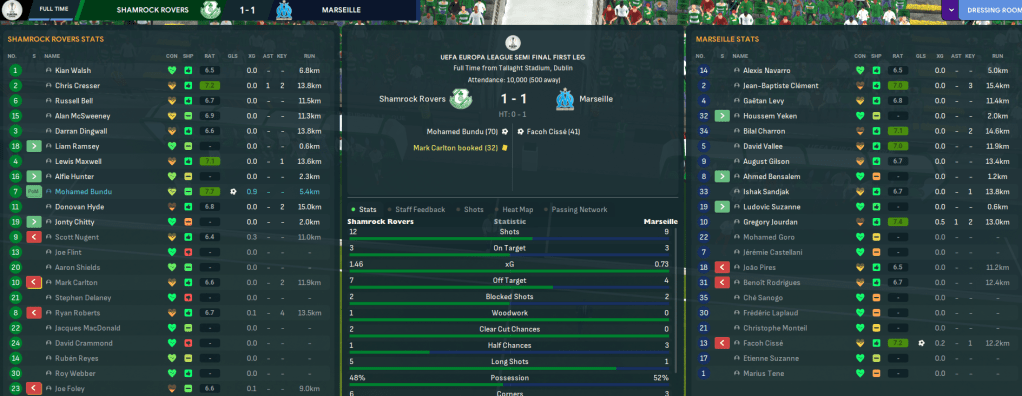 It’s fair to say Marseille’s players don’t play too many games when a wayward shot flies into a car park. Yet that was the case as they visited Tallaght Stadium for the first leg of the Europa League semi final. Shamrock started well only for Marseille to take the lead from a corner. However, the hosts were absolutely brilliant after the break and Foley hit the post before Bundu replaced him and grabbed a deserved equaliser. They even out-shot Marseille en route to a superb 1-1.