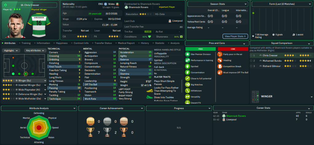 The best player at Shamrock is left winger Donovan Hyde, who has no left foot and was bizarrely on the loan list when Mahtal joined, along with goalkeeper Kian Walsh, right back Chris Cresser, Montserrat international attacker Scott Nugent and midfielder Lewis Maxwell. They also had a couple of youth talents in winger Joe Foley and 6ft 6in centre back Aaron Shields. The required formation was pretty obvious to Mahtal, given he had decent full backs, wingers and centre backs, a few solid midfielders and one good striker. He went with a flat 4-3-3 that offered attacking threat but also aimed to be defensively solid.
