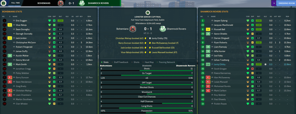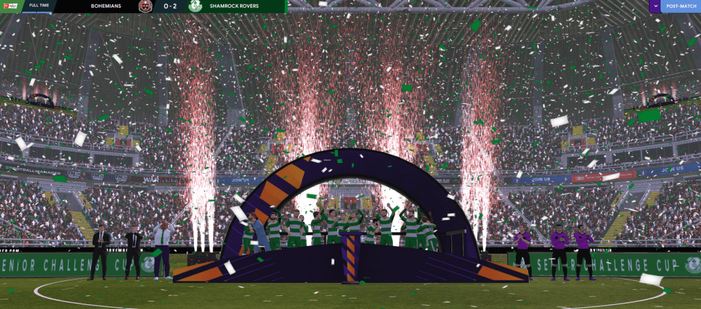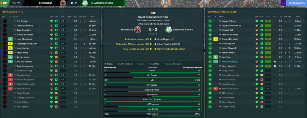 Mahtal’s early days at Shamrock included the Leinster Senior Cup, in which a rotated team breezed into the final to face Bohemians. The two sides played out a poor game and Chitty’s 70th-minute winner was the only highlight before Foley missed a late one-on-one. Bohemians won a 4th successive Leinster Senior Cup! Later in the season, they also entered the Senior Challenge Cup and eased past Pike Rovers, Cockhill Celtic and Cork then beat Derry 5-3 in the semis to tee up yet another final with Bohemians. A livelier game saw Nugent head home on 11 minutes as Shamrock dominated their rivals by 10 shots to one in the first half. They killed the game after the break and Tvedberg rifled in a late second to wrap up a famous quadruple!