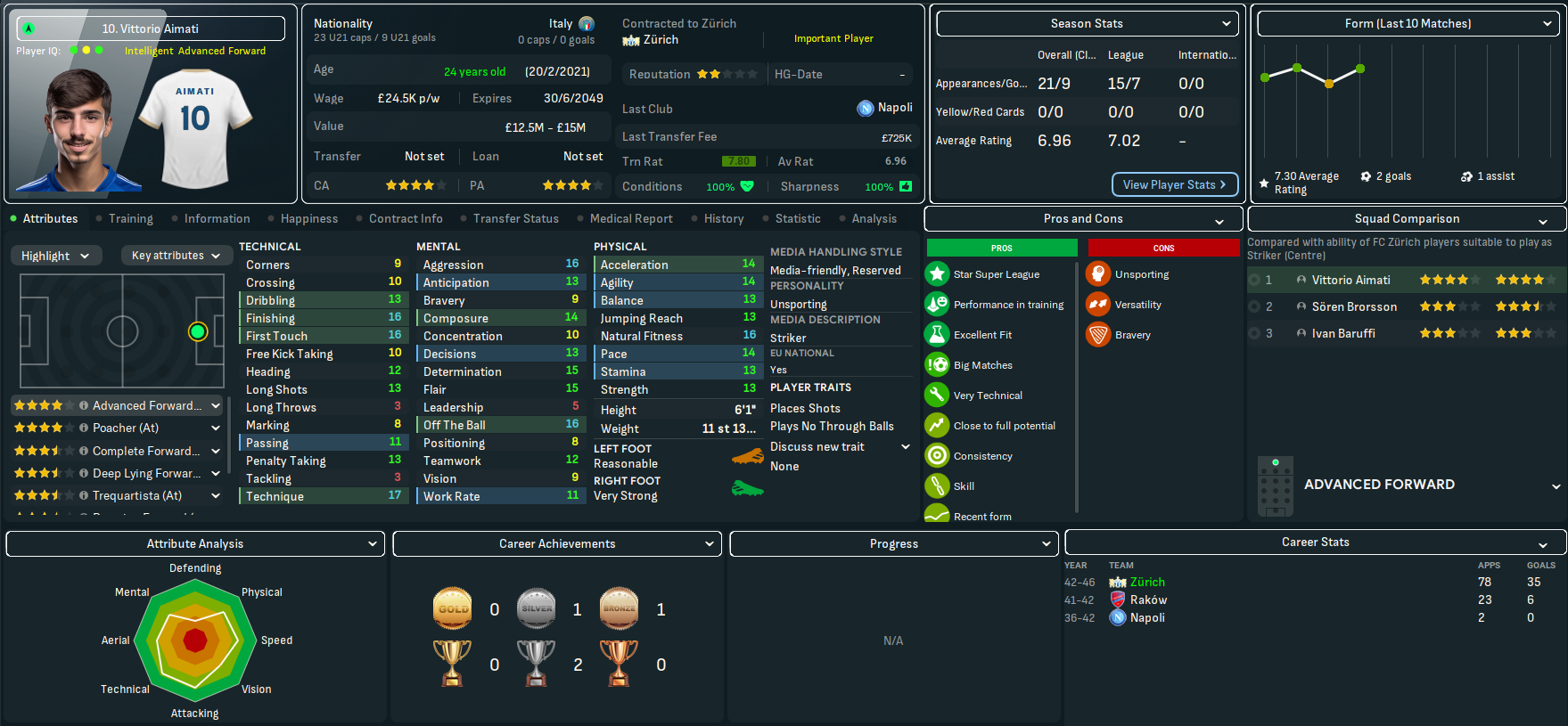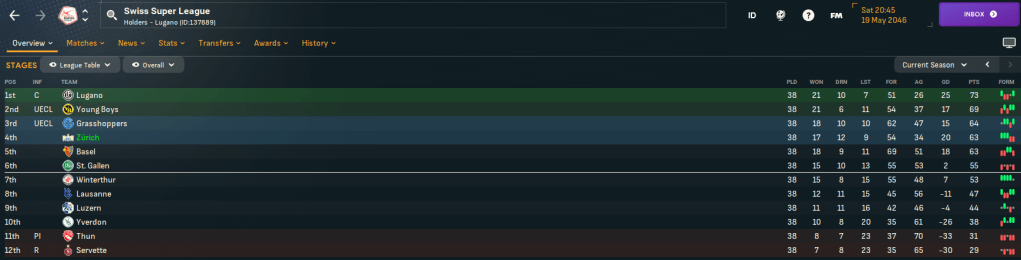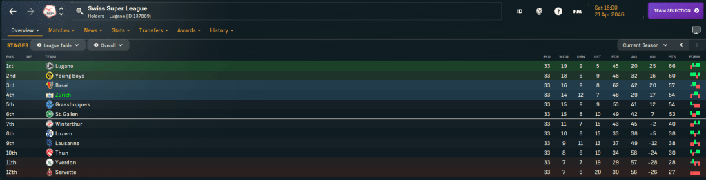 The newly streamlined Zürich kicked off 2046 with a dominant 3-0 win at rivals Servette led by Matika’s brace and a late Aimati strike. That ushered in a strong start to the year as Aimati nicked a 1-0 win over Luzern and a 1-1 at Basel before first-half goals by converted winger to midfielder Aurel Ansermin, striker Søren Brorsson’s goal of the month winner and Matika inspired a 3-0 win over 11th-place Thun and a Brorsson brace led a 3-2 success over Lausanne. And the improvement was confirmed as Brorsson’s late header snuck a 1-1 at leaders Lugano, who’d bizarrely gone seven games without a win after only dropping points three times in the opening 19 games.