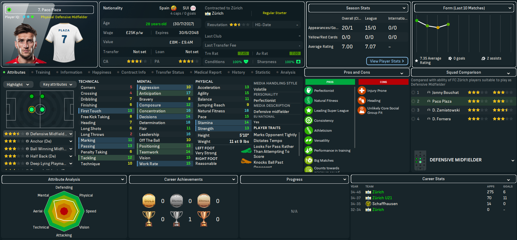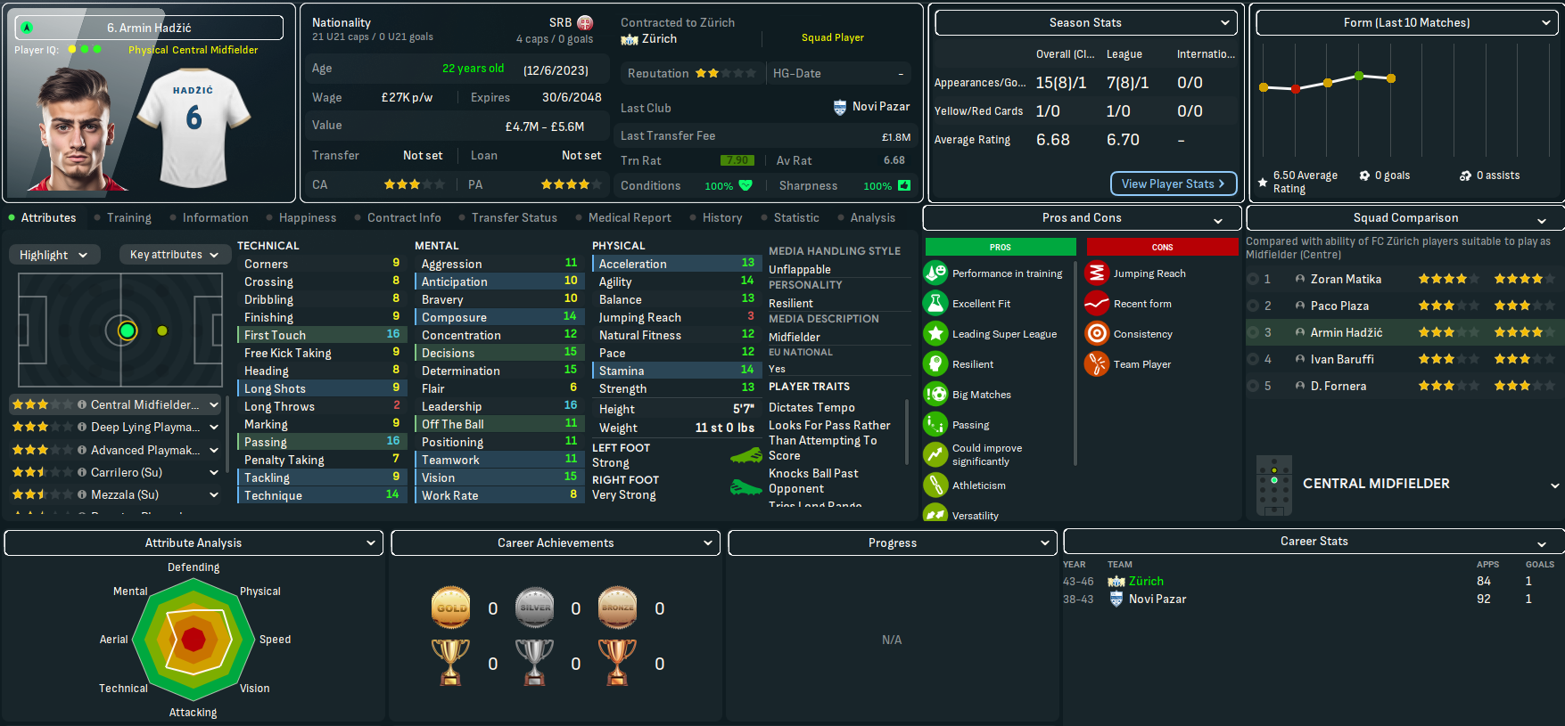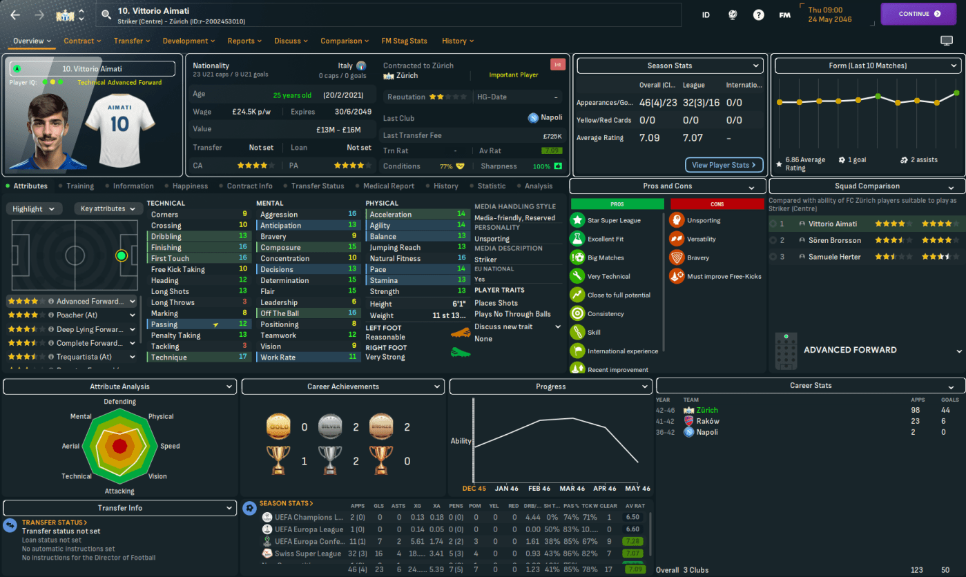 FCZ play at the 26,104-capacity Letzigrund, which was built way back in 1925 (that’s 120 years ago). That’s supported by a strong infrastructure of 20 youth recruitment and training facilities, 18 youth facilities and 17 junior coaching, with a 3.5-star reputation. The finances look less impressive with just £2.2m in the bank, a £7m transfer budget and £481k weekly wage budget, of which £70k was spare.