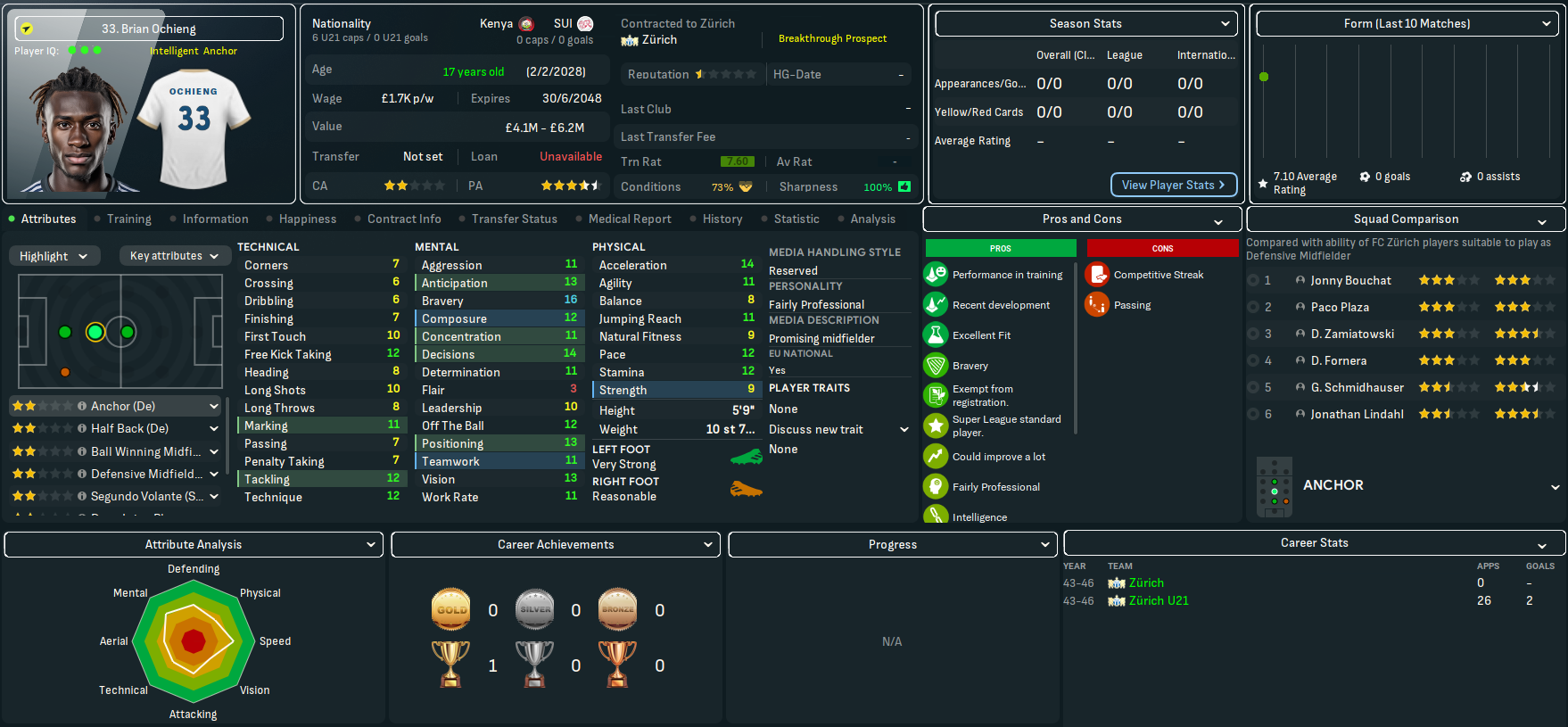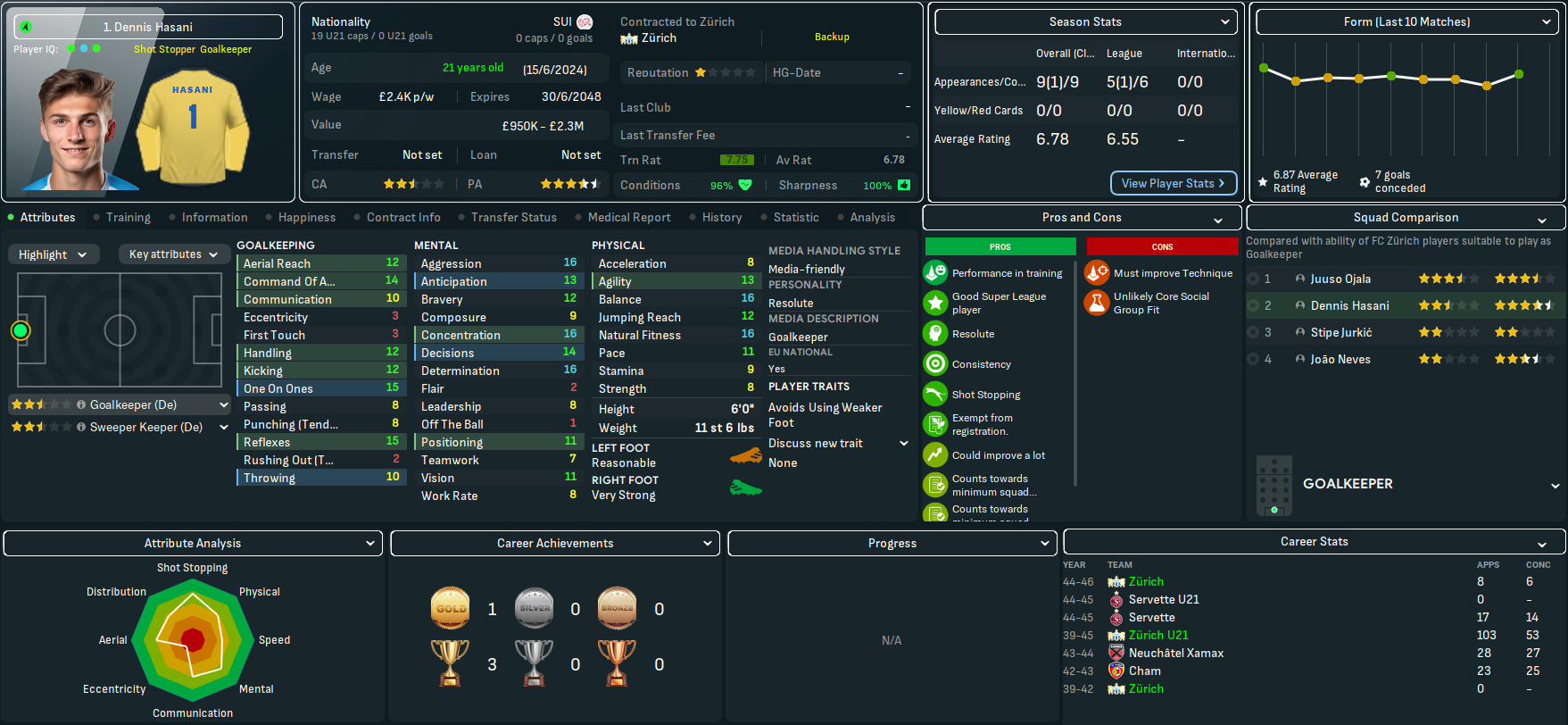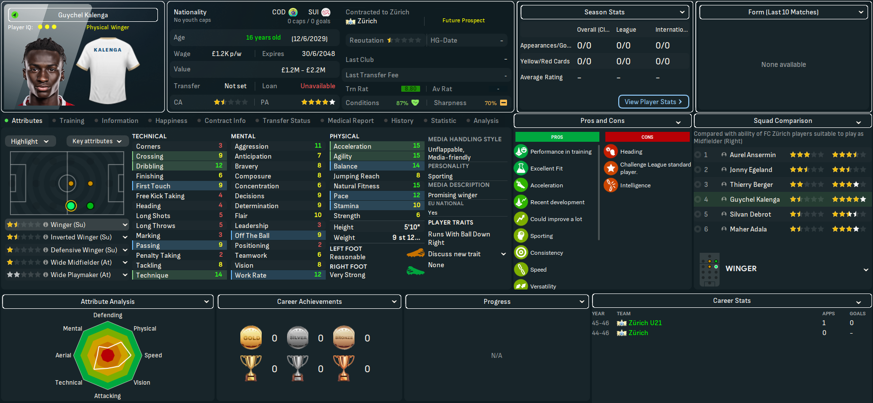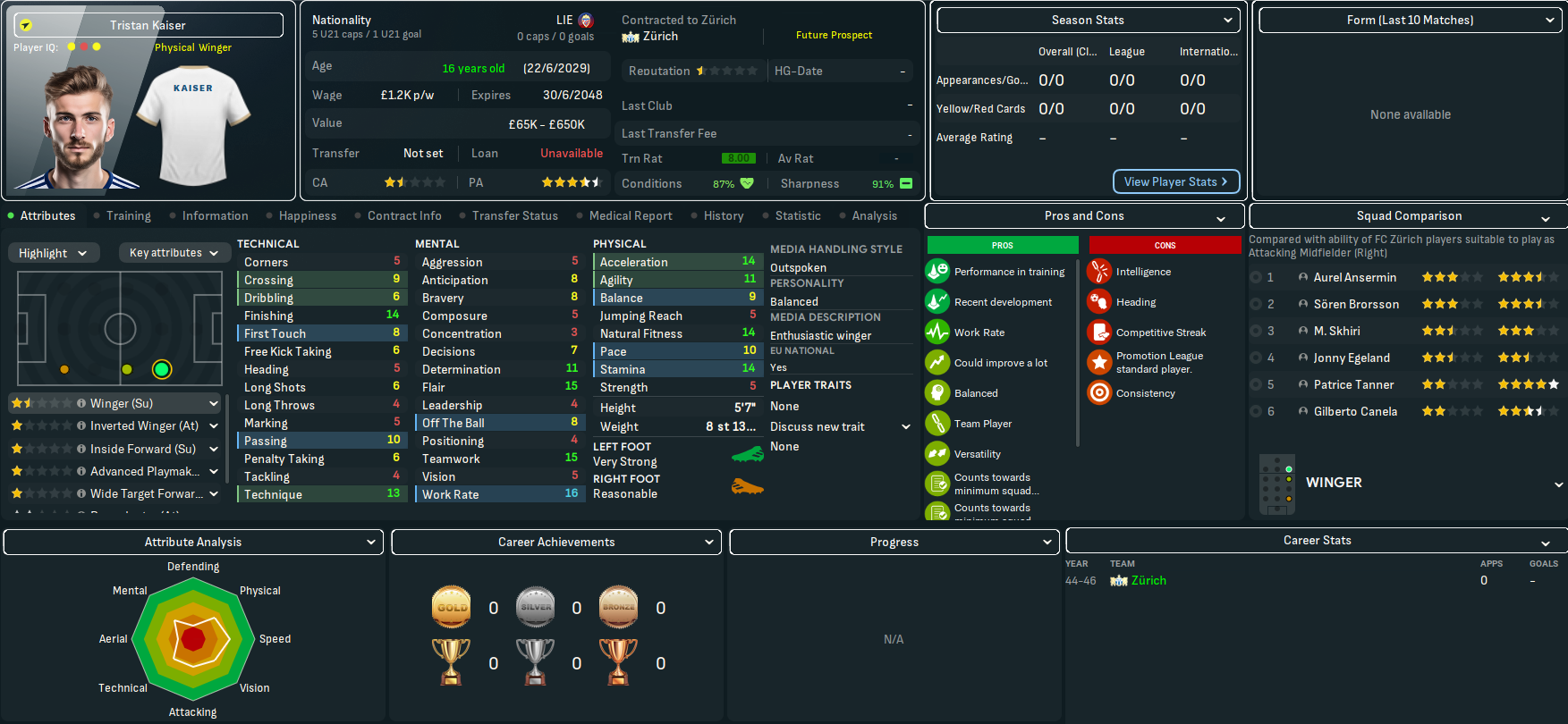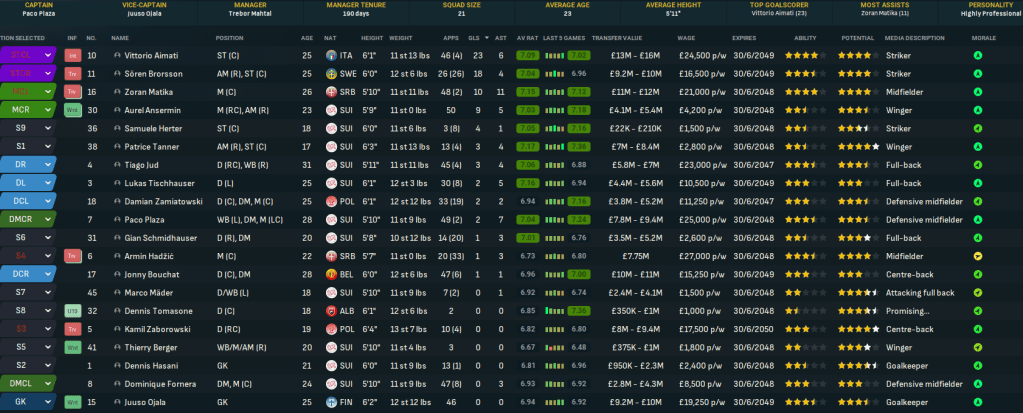 The best player at Zürich is striker Vittorio Aimati along with midfielders Zoran Matika, who’d bizarrely been transfer listed, and Paco Plaza, goalkeeper Juuso Ojala, centre back Jonny Bouchat and full back Tiago Jud. They also had several decent youth prospects in goalkeeper Dennis Hasani, midfielders Brian Ochieng and Armin Hadzic and wingers Patrice Tanner, who Mahtal planned to retrain as a striker, Guychel Kalenga and Tristan Kaiser. Mahtal noticed a few obvious issues, the most clear being there wasn’t a single left winger in the first team and the best right winger had one assist in 14 games. That pretty much forced him into a narrow 4-4-2 that he wasn’t massively sold on long-term.