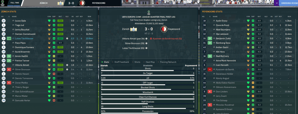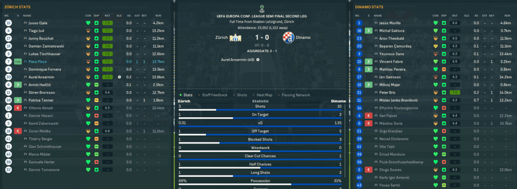 They got the best last 16 draw against Gibraltar side Magpies FCB and won 3-0 away and a rotated side won 3-2 at home. A tougher quarter final followed against Feyenoord. The home leg was up first and technology gave Zürich a helping hand as, out of nowhere, the ref stopped the game to run over to his screen and give a penalty that Aimati converted. Zürich won the ball back from the kick off and countered for Brorsson to head home a second before left back Lukas Tischhauser’s first goal for the club after an hour. Feyenoord offered no threat and Mahtal settled for a convincing 3-0 win, and a 2-1 loss in the Netherlands eased Zürich through.