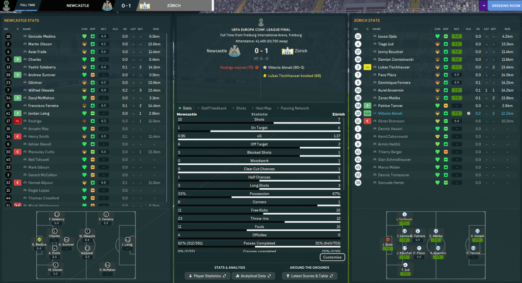 Newcastle had the best early chances but didn’t hit the target with their five first-half shots while Matika had a curled effort pushed wide. The two sides continued to struggle in front of goal and it looked to be drifting to a 0-0. However, in the third minute of injury time, substitute Tanner beat three tired defenders down the left and crossed for Ansermin on the edge of the box. His cushioned header found Amiati in space and the striker turned and fired home on the half volley to send the Zürich fans and Mahtal into absolute pandemonium. There was no time for Newcastle to respond and, yet again, one goal was all they needed. Newcastle will possibly feel hard done by but, in fairness, they only got one of their 10 shots on target and Zürich just about edged it on xG.
