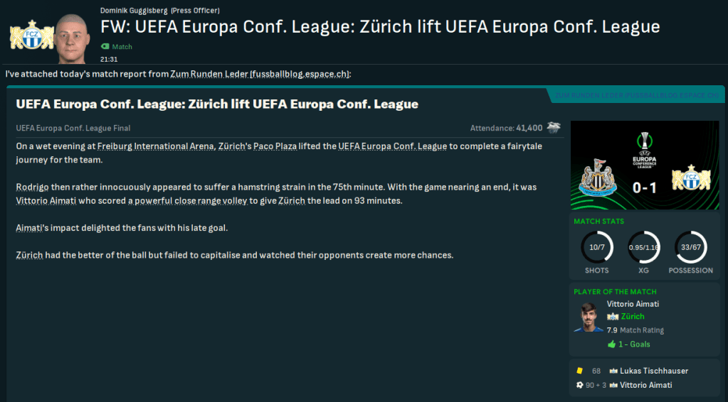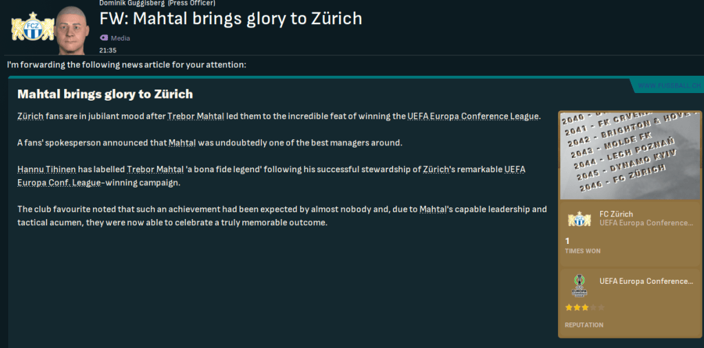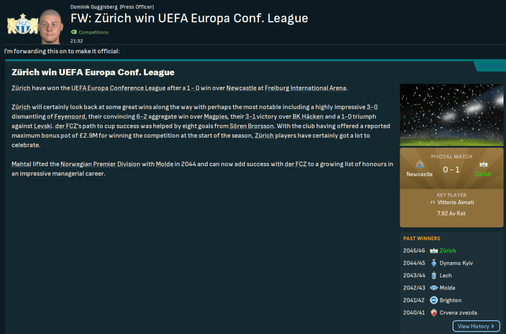 Mahtal’s love affair with the ECL continued as he led a team into the Final for the fifth time – having won it with Kyiv in 2029, Djurgardens in 2039 and Molde in 2043 and been runner-up with Slovan Bratislava in 2035. 41,000 supporters from Switzerland and England converged on Freiburg International Arena as Zürich aimed to go one better than their 2041 defeat to Crvena zvezda, while Newcastle were looking for a second ECL having won it way back in 2025. Mahtal’s only injury concern was Zaborowski picking up a knock, so he lined up: