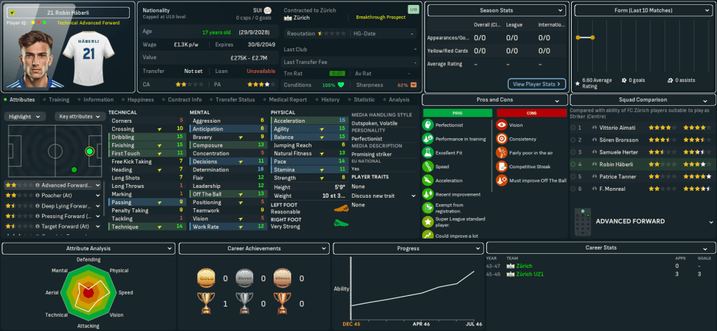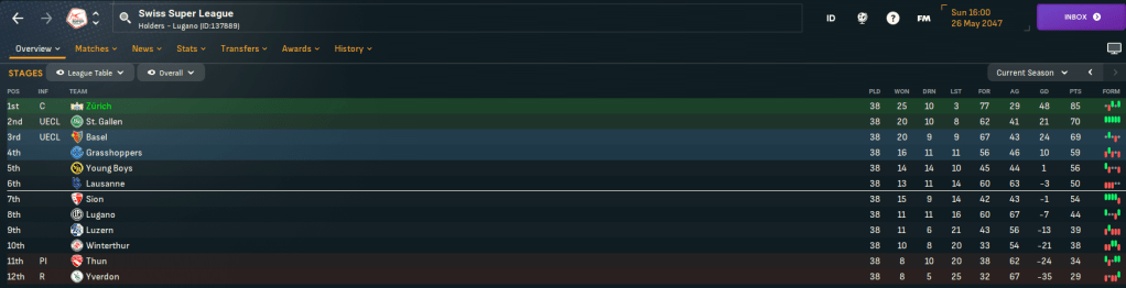 A love affair with Europe’s third club trophy continued as Trebor Mahtal’s FC Zürich lifted his fourth Europa Conference League in 2046. Mahtal now wanted to build on that success by improving the Swiss side’s domestic fortunes.