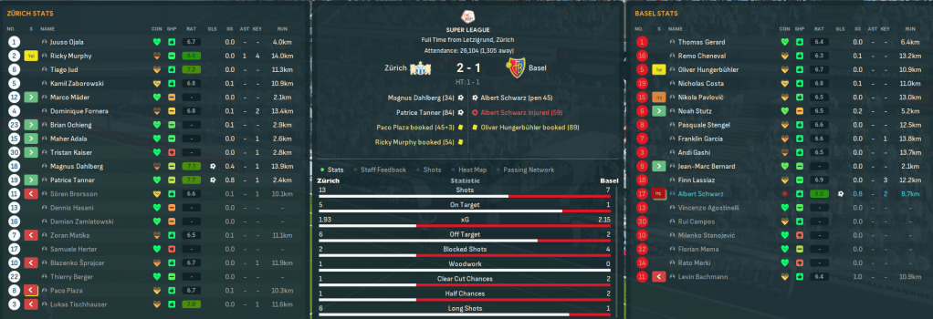 Life without Aimati began with Sprajcer edging a 1-0 win at home to Sion and a 0-0 at Lausanne, which convinced Mahtal to move away from his two-striker formation. That looked an inspired move as Dahlberg, who’d come into the team as a trequartista, opened the scoring at home to 2nd-place Basel. Typically, the ref enabled Basel to score their only shot on target from a nonsense penalty. But Mahtal had the last laugh as a triple substitute of youngsters paid off with midfielders Tristan Kaiser and Ochieng combining to tee up a late winner for striker Patrice Tanner.