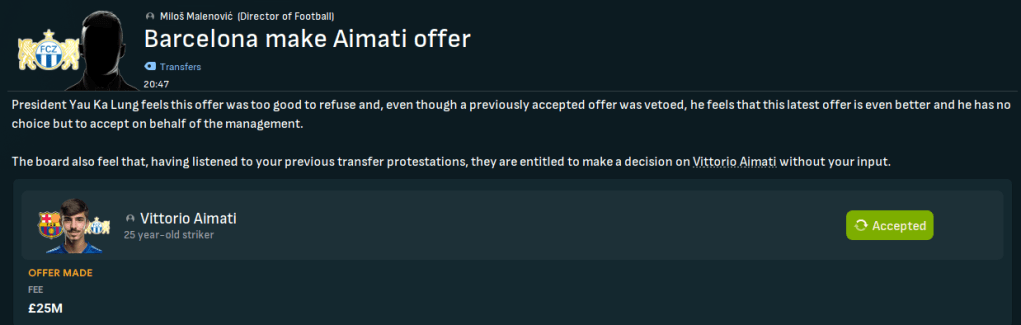 Mahtal’s plans were rocked when club president Yau Ka Lung undermined him to accept Barcelona’s £25m offer for star player Aimati, despite the manager already protesting a previous bid. Mahtal was furious, especially as the deal went through after the Europa League registration deadline.