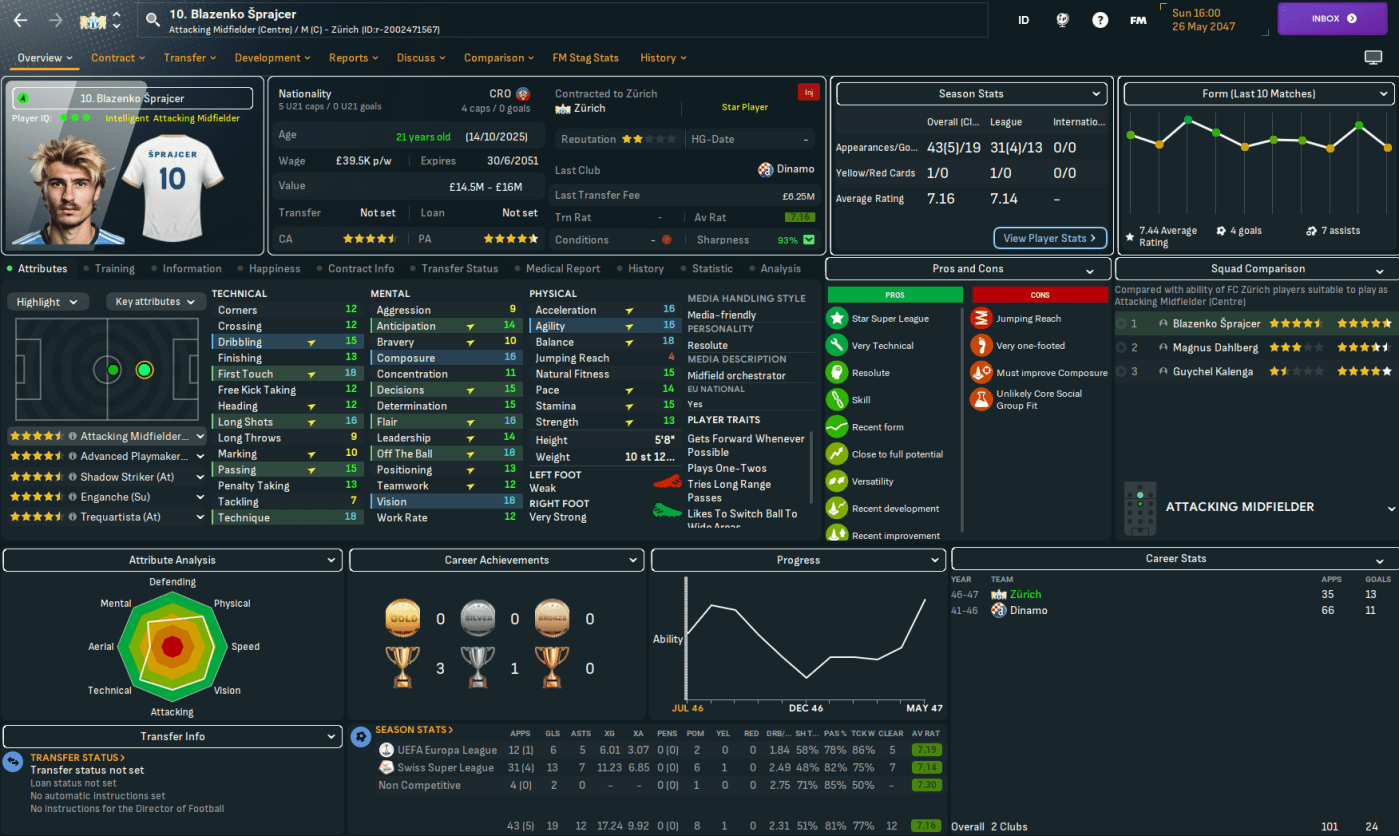 A love affair with Europe’s third club trophy continued as Trebor Mahtal’s FC Zürich lifted his fourth Europa Conference League in 2046. Mahtal now wanted to build on that success by improving the Swiss side’s domestic fortunes.