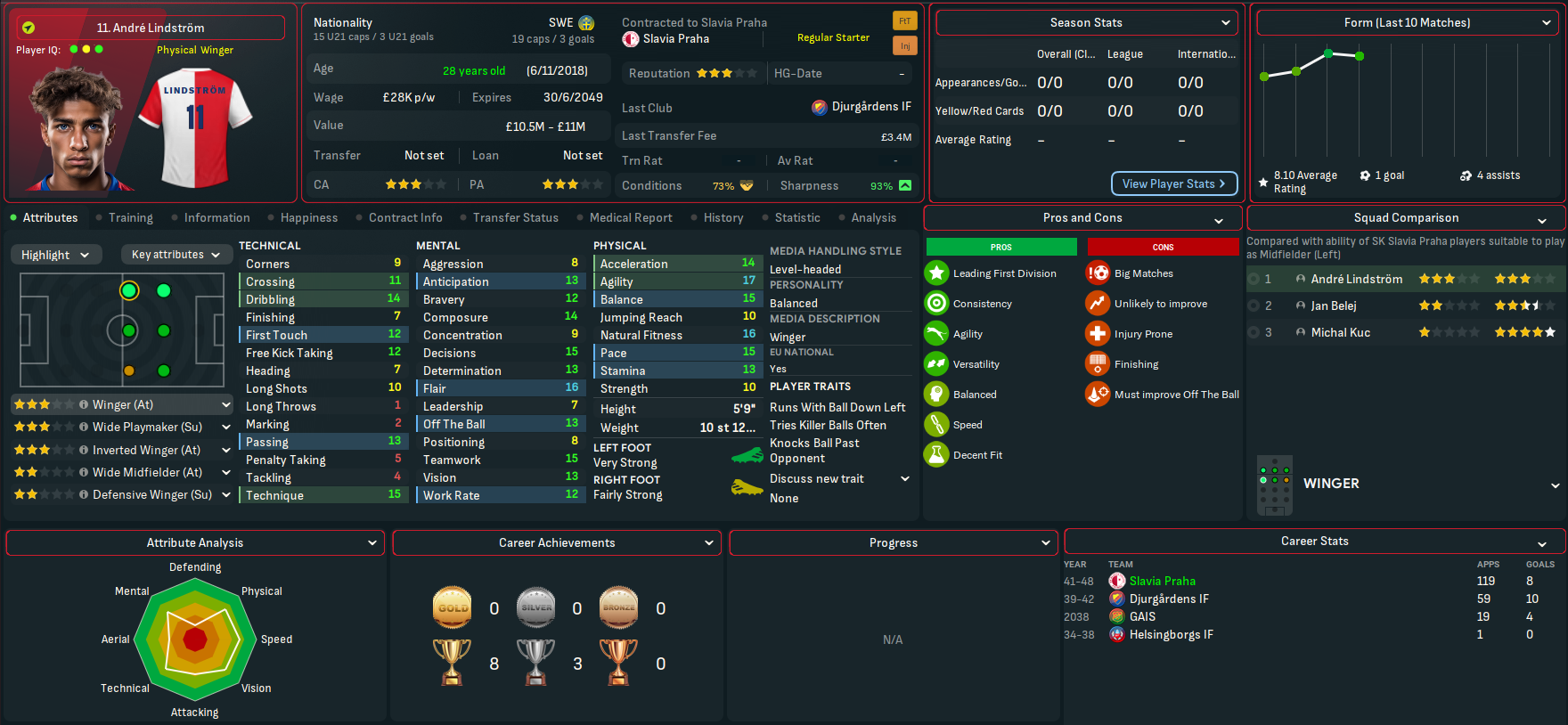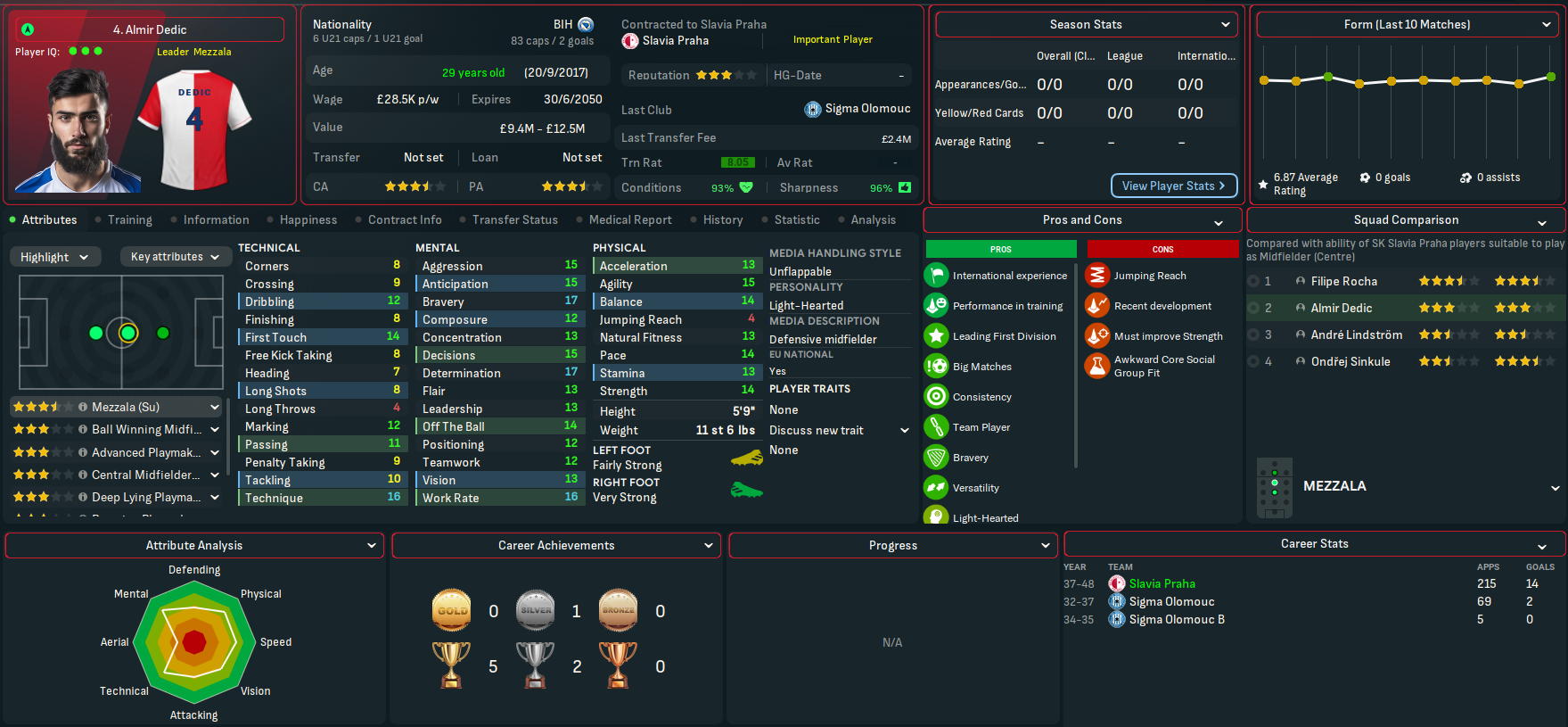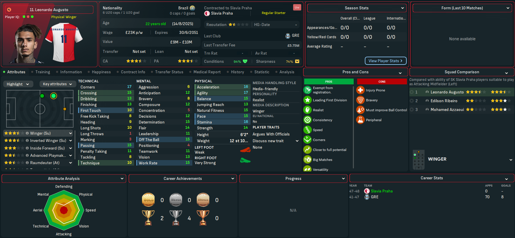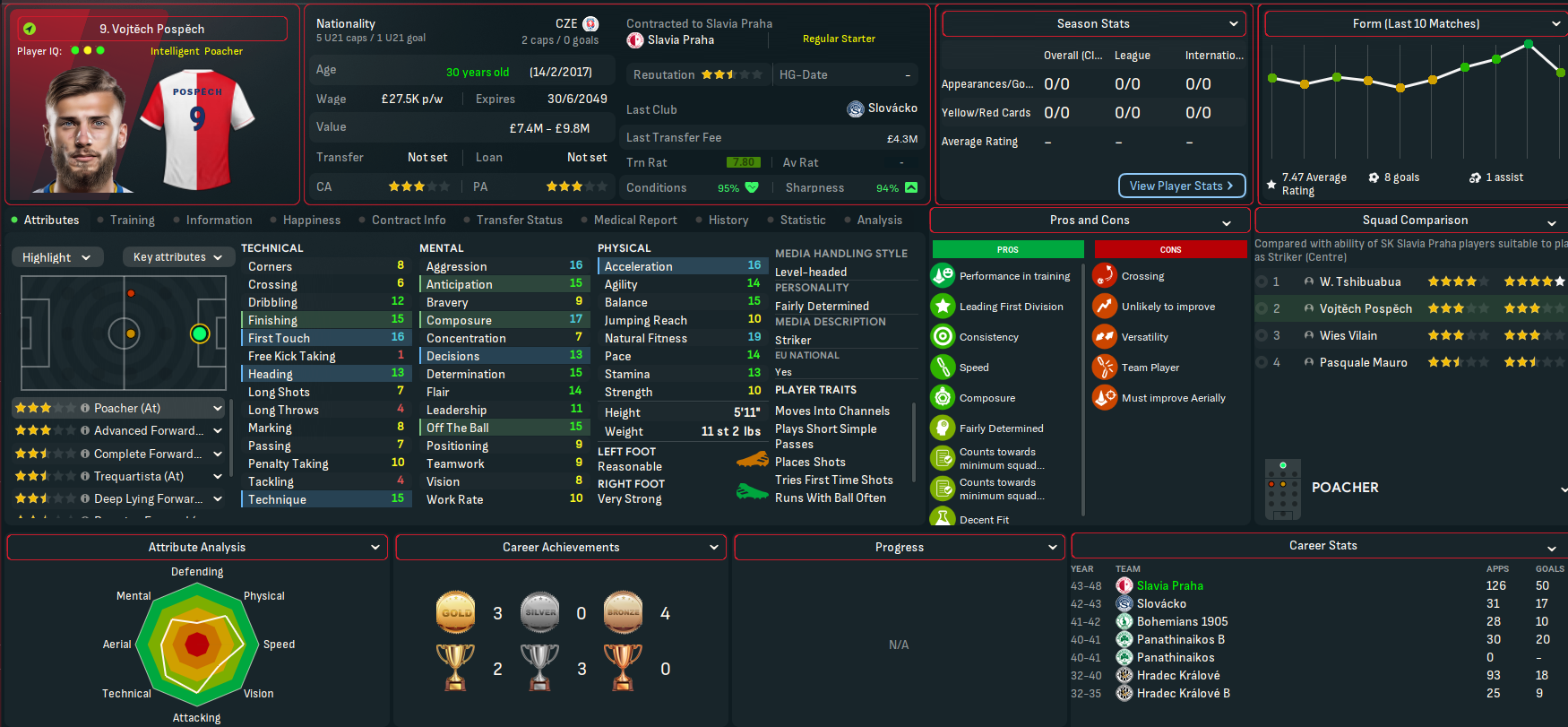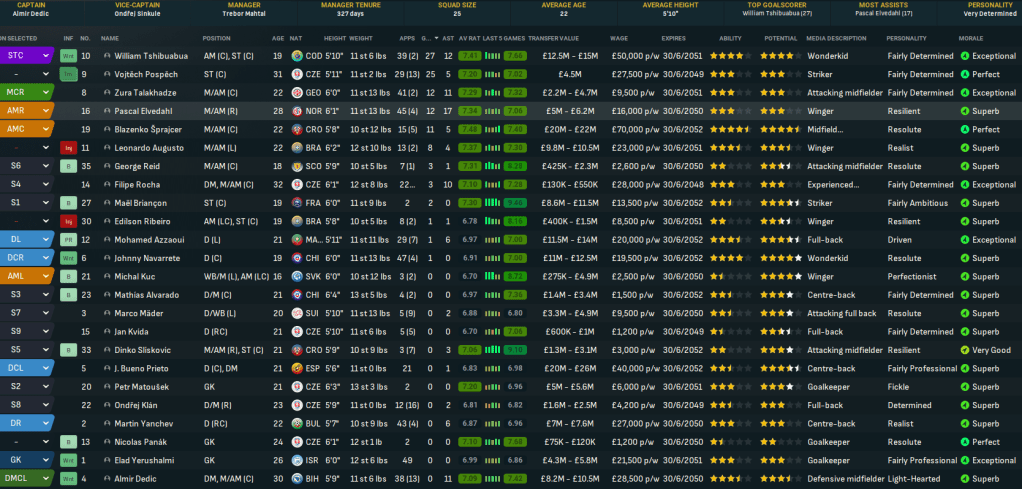 Slavia plays at the 20,232-capacity Eden Arena, which was built in 2008 and is supported by a strong infrastructure of 20 youth recruitment and 17 training and youth facilities and junior coaching. The club is in a great place financially with a bank balance of £53m, transfer budget of £32m and weekly wage budget of £756k, of which it was spending £490k. Mahtal wasted no time in adding to that, selling 19 players for a profit of £16m, including a striker who scored 3 in 26 last season to Aluminij for £6m.