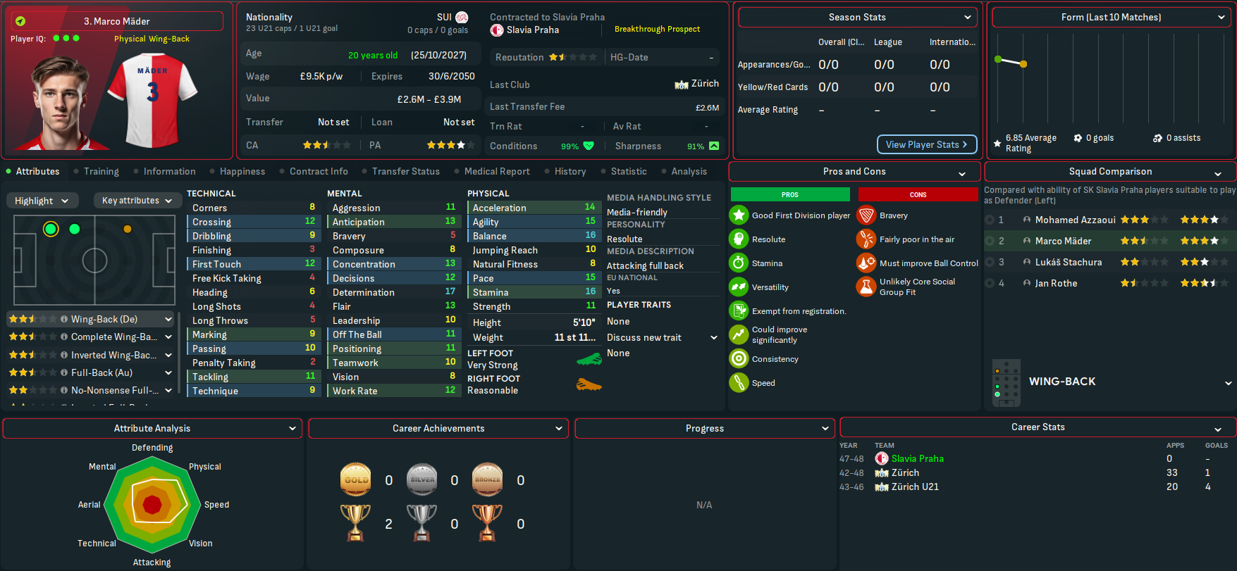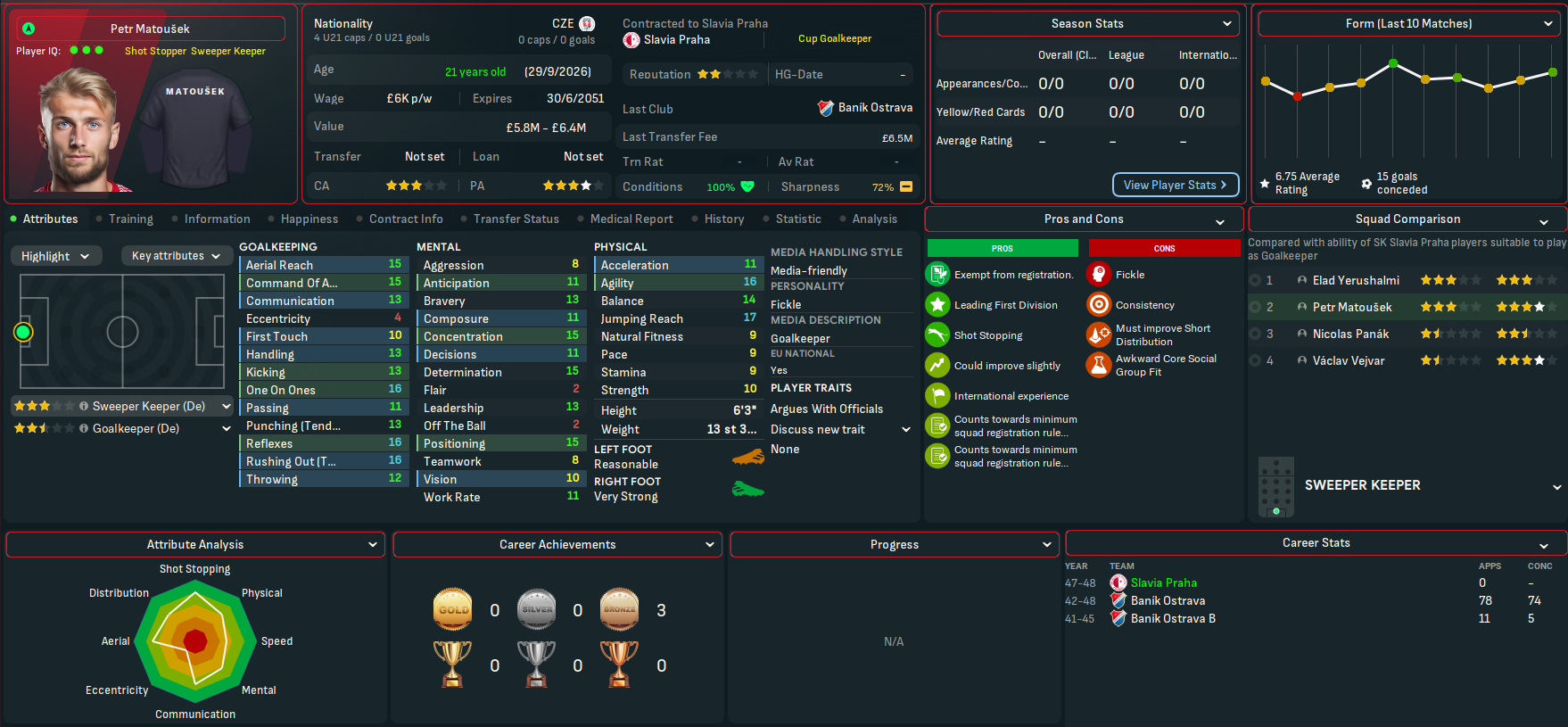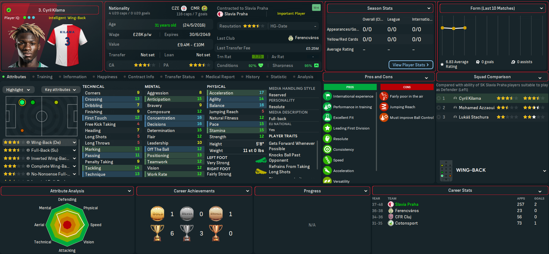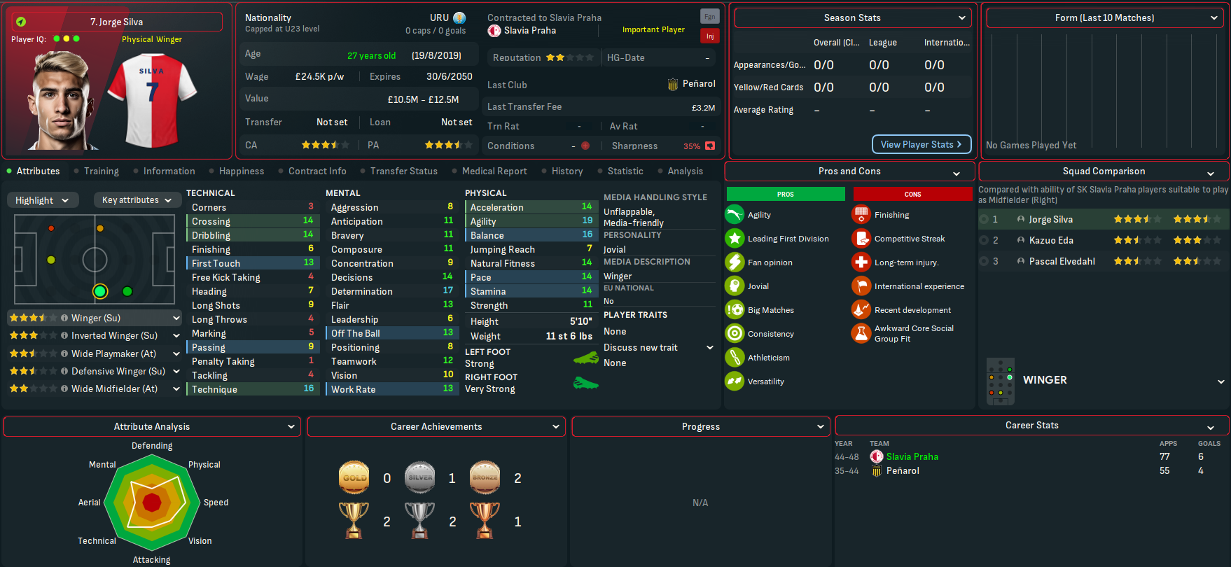 Slavia plays at the 20,232-capacity Eden Arena, which was built in 2008 and is supported by a strong infrastructure of 20 youth recruitment and 17 training and youth facilities and junior coaching. The club is in a great place financially with a bank balance of £53m, transfer budget of £32m and weekly wage budget of £756k, of which it was spending £490k. Mahtal wasted no time in adding to that, selling 19 players for a profit of £16m, including a striker who scored 3 in 26 last season to Aluminij for £6m.