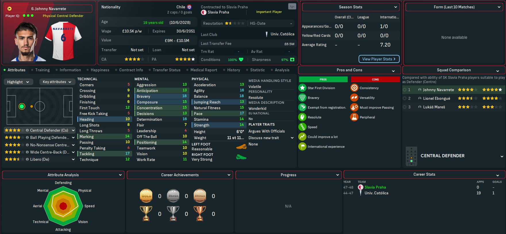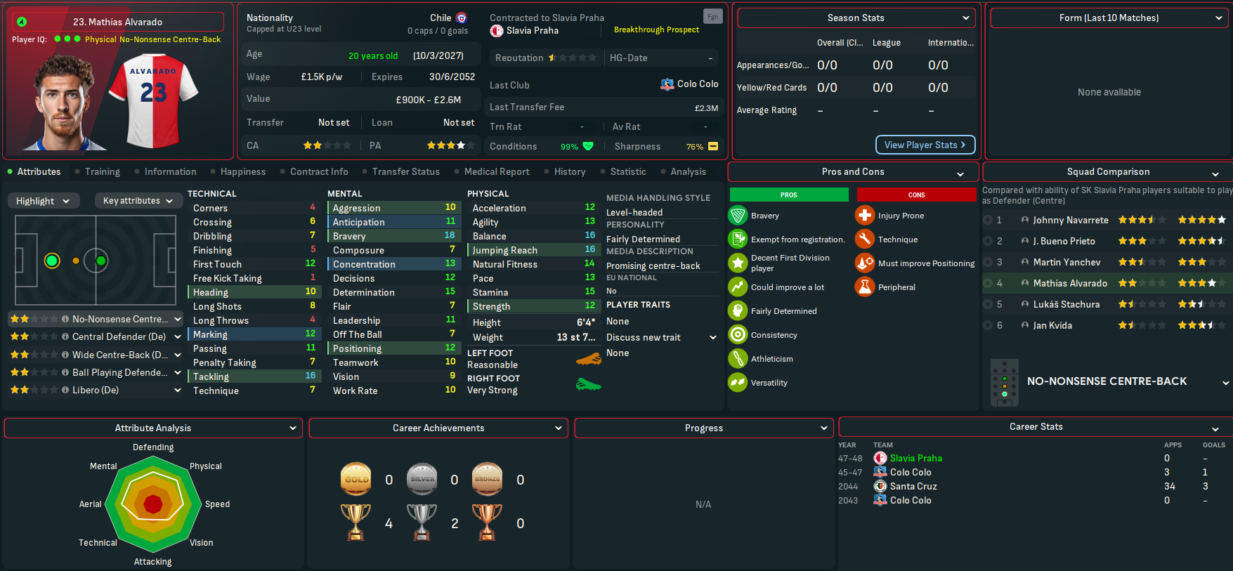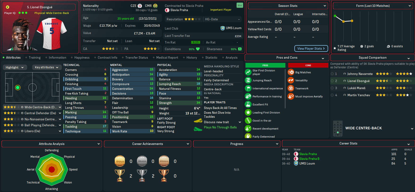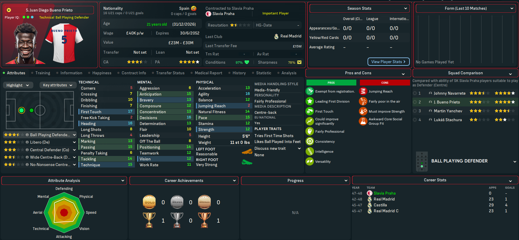 Slavia plays at the 20,232-capacity Eden Arena, which was built in 2008 and is supported by a strong infrastructure of 20 youth recruitment and 17 training and youth facilities and junior coaching. The club is in a great place financially with a bank balance of £53m, transfer budget of £32m and weekly wage budget of £756k, of which it was spending £490k. Mahtal wasted no time in adding to that, selling 19 players for a profit of £16m, including a striker who scored 3 in 26 last season to Aluminij for £6m.
