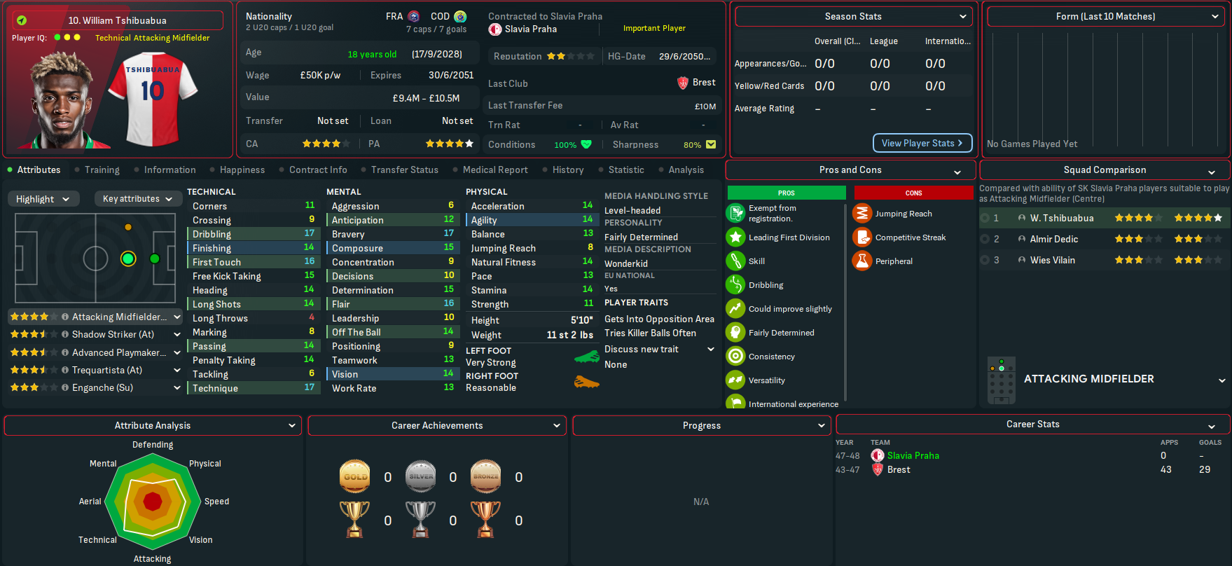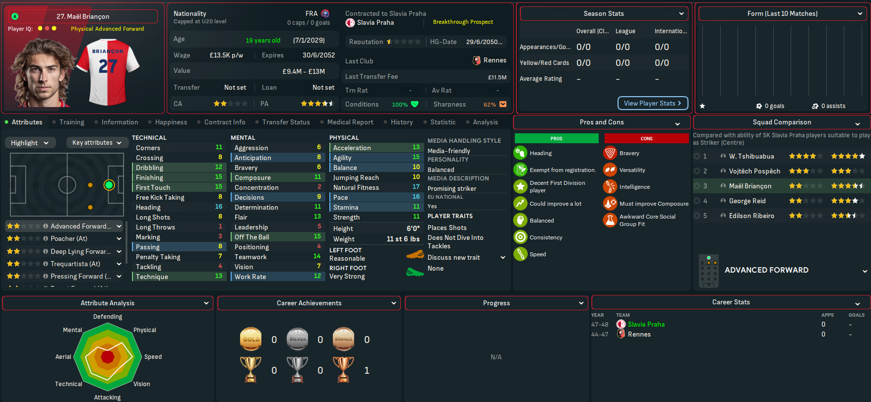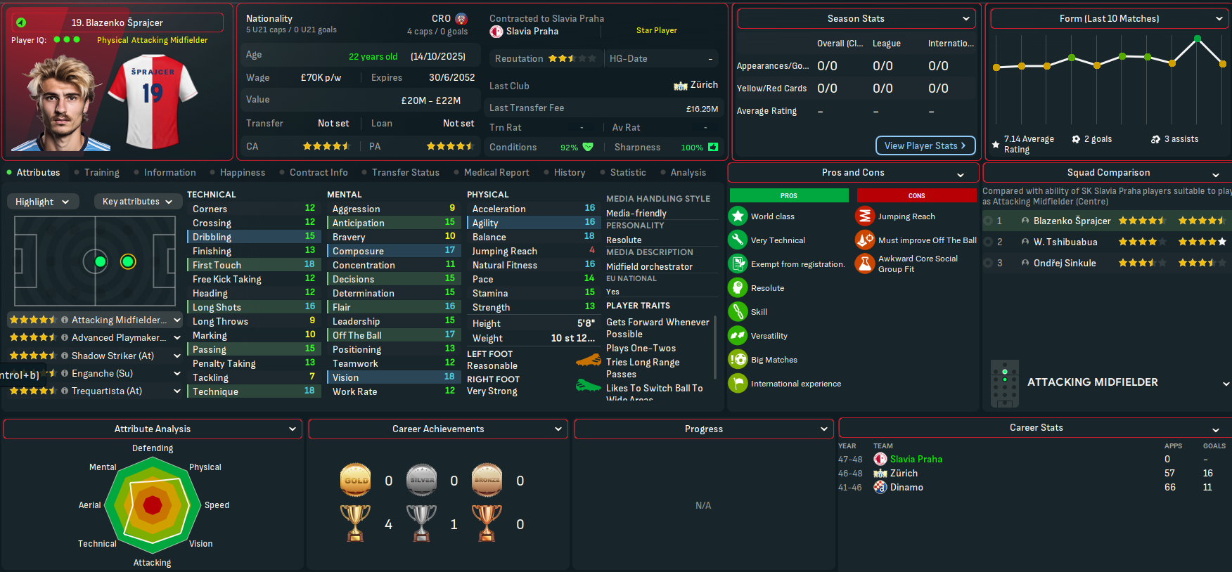 Those signings gave Mahtal arguably the most exciting team he’d ever put together. He moved Tshibuabua up front to cater for Sprajcer, which worked nicely as the former scored the opener, the latter scored twice and fellow debutant Augusto scored one and made one as Slavia began 2048 with a 4-1 win at Karviná. That was backed up by easing past bottom-side Chrudim 3-0 with Sprajcer and Augusto scoring again, a 6-1 destruction of Brno with a Sprajcer brace and Tshibuabua hat trick. And even rotated sides maintained the momentum as 17-year-old homegrown Scottish midfielder George Reid scored twice on debut in a 3-0 win over Vysehrad and Talakhadze bagged a hat trick in a 3-2 win at Slovacko.