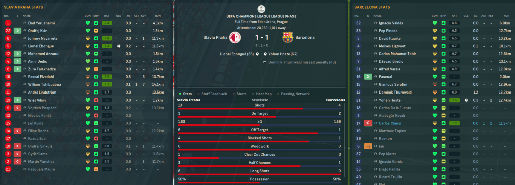 The league phase began with Mahtal returning to Panathinaikos, who he left 18 years ago, and they were a little unlucky to lose 1-0. But Slavia were fantastic in their first home game, battering Leipzig by 22 shots to 9 and winning 5-2 led by Pospech’s brace and Navarrete’s first goal for the club. A 2-0 loss at Porto followed before starting really brightly at home to Barcelona, having six shots in the first 15 minutes. And they made it count as Ebongué slammed home a header from a corner on 26 minutes. The ref – obviously – awarded Barcelona a chance to score their first shot, but Elad Yerushalmi pulled off a huge save. Barca eventually equalised from their third shot as Slavia faded after the break but eventually secured a point, despite having 13 shots to 4.