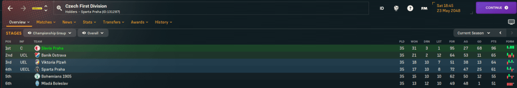 That result meant the title was virtually secure, given Slavia moved 20 points clear with 10 to play. And Slavia did secure their 19th title and Mahtal’s 16th with five games remaining, before the so-called Championship Group began. They went on to smash Sparta’s all-time record of 86 points, set back in 2022, as they finished on 96 points after 31 wins, 3 draws and just the 1 defeat, to finish a massive 31 points clear of Baník. They scored 95, just 3 short of their own record of 98, and only conceded 27.